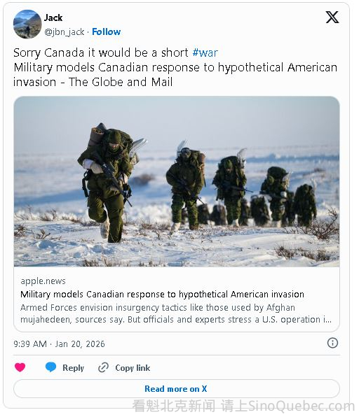 据加拿大《环球邮报》今天(1月20日)以两名加拿大政府高级官员为消息源报道称,加拿大武装部队已模拟美国从南部入侵的场景,并预计美军将在一周内——甚至可能快至两天——突破加拿大在陆地和海上的战略防线。 据信这是加拿大一个世纪以来首次模拟“遭到美国攻击”。加拿大是北约创始成员国,加拿大和美国还是北美防空司令部合作伙伴。 报道称,消息人士表示,“加拿大既缺乏足够的军事人员,也没有抵御美军进攻所需的先进装备”——因此,加拿大军方设想采取“非常规作战方式”:由小规模非正规武装或武装平民组成的小组,通过伏击、破坏、无人机作战或游击战术展开行动。 而此类战术的目的是“对美军占领部队造成伤亡”。