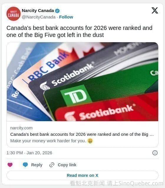 想知道2026年把钱存在哪家加拿大银行最划算吗?最新发布的一份榜单,可能会让不少人感到意外——尤其是那些一直使用加拿大“五大银行”的客户。 日前,理财平台 moneyGenius 公布了 2026年“最佳银行账户”评选结果,涵盖支票账户(Chequing)和储蓄账户(Savings)等多个类别,对全加拿大的银行产品进行了系统评比。 结果显示,尽管多家知名银行榜上有名,但加拿大第二大银行TD(道明银行)在今年的评选中竟然颗粒无收,在所有奖项中均未上榜,引发关注。 数字银行与传统大行同台竞技 本次获奖机构既包括 RBC、丰业银行(Scotiabank) 等传统大行,也有 EQ Bank、Wealthsimple、KOHO 等数字银行和金融科技平台。榜单的多样性,也让不少消费者开始重新审视自己的理财和银行选择。 根据媒体NARCITY的报道,moneyGenius 表示,所有账户均通过其数据驱动的 Genius Rating 评分体系进行评估,综合考量了月费、利率、奖励、福利和整体性价比等多项因素。 2026年加拿大最佳银行账户一览(重点类别) 最佳综合支票账户 |