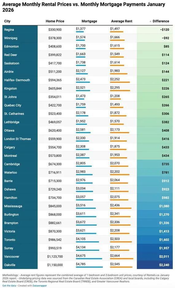 如果你是一位首次购房者,正希望能在房地产市场上找到机会,或许可以考虑离主要城市更远的地方。 Zoocasa于周一发布了一份新报告,解读了2026年加拿大购房的租金与售价比例。 ![]() 报告指出:“现在是购房的好时机吗?这个问题很复杂。一方面,租金处于历史低位;另一方面,房价已经下降,房源量也在增加,为买家提供了难得的机会。” 报告发现,尽管大多数媒体关注的是加拿大购房的高成本,但市场中仍有一些地方,按揭的支付实际上比租金更便宜,在这些加拿大城市,购买房屋比租房更划算。 ![]() 根据Zoocasa的数据,里贾纳(Regina)和温尼伯(Winnipeg)是购买房屋能够立即实现每月节省的唯一两个城市。 里贾纳的平均房价为330,900加元,预计每月按揭为1,377加元,而平均租金为1,497加元。 报告指出:“在里贾纳,每月的按揭支付比平均租金少120加元,而在温尼伯,房主的支出比租客少92加元。” 在温尼伯,平均房价为378,300加元,预计每月按揭为1,574加元,租金则为1,666加元。如果选择购房,相比在曼尼托巴省的首府租房,你每月可以节省92加元。 报告还提到,埃德蒙顿(Edmonton)在这一趋势中也是一个显著的例外。虽然那里租房在技术上更便宜,但差距非常微小,仅为每月85加元。“对于许多在埃德蒙顿的潜在买家来说,这一微小的差距表明,从租房到购房的转变比全国其他地区更为可及。” Zoocasa表示,除了这三座城市外,租房仍然是更为经济的选择;节省额度因城市而异。 ![]() 在渥太华、蒙特利尔和卡尔加里等大城市,租金与拥有的价格比例差距扩大,租客每月可节省400到450加元。 报告称:“在安大略省南部的滑铁卢和汉密尔顿等中心城市,差距进一步加大,租金节省接近1,000加元。” “与此同时,在大多伦多地区和卑诗省的部分地区,差距则变得相当显著。” 以多伦多为例,租房相比购房每月可以节省1,957加元。在温哥华,租房的节省金额超过2,000加元。 这并不是唯一一项关注温尼伯可负担生活成本的排名,Tangerine也将其评选为“生活成本低”的最佳城市。 |