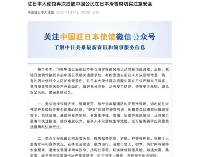 25日下午,有网友发帖求助,称朋友6人被困? 日本新潟县八海山“死亡谷”,希望有人能够帮忙救援。26日下午,中国驻新潟总领事馆一名工作人员告诉极目新闻记者,被困的6名中国同胞已于当地时间26日上午11时许被营救出来,被困将近20小时,无外伤,身体状况良好。 ![]() 网友发帖截图 据网友发帖,25日15时许,朋友6人被困?日本新潟县八海山“死亡谷”,希望有了解八海山的大神们救救他们。评论区网友纷纷为他们出谋划策,也有网友认为成年人应当为自身行为承担相应责任。 26日下午,极目新闻记者就此事联系上中国驻新潟总领事馆。一名工作人员回复称,25日确有6名中国同胞被困八海山滑雪场,6人含5名大陆同胞、1名台湾同胞,均为30至40岁男性,系前往当地滑雪时被困,26日11时许已被成功营救。 25日日下午,总领馆工作人员关注到社交平台上的求助信息后,立即介入处置,主动联系日本警方,协调部署救援事宜,同时与警方保持密切沟通,持续追踪被困人员的身体状况、所处位置等信息,并建立专门群组,由当事人实时更新位置及身体状况,同步开展救援预案筹备工作。 “昨天晚上山上的体感温度大约为零下18℃,有民间救援人员前去营救,但因持续降雪,救援难度大,于是下撤。当地民间救援收费为每人100万日元,暂不清楚他们是否已支付。”该工作人员说。 ![]() 网友发帖截图 26日清晨,日本警方组织了两支救援队,分别从山上、山下双向开展救援。当地时间上午10时许,发现被困人员,将近12时,将6人营救下山,全员安全脱困。此次6人被困时长将近20小时,均无明显外伤,身体状况良好。此外,该工作人员提到,24日,当地刚成功营救一名被困的中国男子,特别提醒大家前往八海山滑雪需注意安全。 接近当地救援队员的一名知情人士告诉极目新闻记者,25日晚,日本当地向导与被困人员达成协议,当晚收费进山开展冒险救援。但现场情况更为复杂:一是被困人员所处位置较此前遇险人员更高,从下方向上搜索难度较大;二是当地持续降雪,救援人员无法渡河,最终选择下撤。 多位救援人员线上指导被困人员自行挖掘雪洞避险,坚持至次日清晨。当地警方及救援力量随即兵分两路展开救援,从上方下降搜索的救援队伍于上午与被困人员取得接触。被困人员经补给休整后,与从下方向上搜救的队伍汇合,一同向下撤离,于中午12时左右全员安全抵达停车场。 极目新闻记者注意到,1月6日,中国驻日本大使馆曾发文提醒中国公民在日本滑雪注意安全。1月26日上午,中国驻日本大使馆再次提醒中国公民在日本滑雪时切实注意安全。 据大使馆发文:每年冬季,均有中国公民在日本参与滑雪等高风险运动时受伤或遇难。近期,我驻日使领馆接到多起中国公民相关遇险求助,有的因擅自前往未开放区域命悬一线,有的因未做好个人防护身受重伤。驻日本大使馆再次提醒中国在日公民和来日游客,参与滑雪等高风险户外运动时,做好充分准备,加强安全防范,遵守安全规则,避免安全风险,确保生命安全。 ![]() 大使馆发文截图 极目新闻记者了解到,在日本的滑雪圈,“死亡谷”通常指八海山等雪场附近一片未开发的、充满粉雪的野雪区域。这片区域因为地形复杂、积雪深、没有固定路径,对滑雪者来说充满挑战和危险,因此得名“死亡谷”。 |