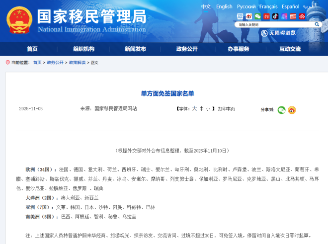 据路透社报道,中国周四同意放宽签证规定,允许部分英国公民免签入境。这一决定是在英国首相基尔·斯塔默(Keir Starmer)访问北京期间达成的,作为双方一项合作伙伴协议的一部分。伦敦方面希望此举能帮助英国扩大其服务业版图。对加拿大来说,卡尼总理访华期间得到中方保证,会开放加拿大公民赴华免签,但目前仍在等待中方最后确认。 ![]() 图源:路透社 斯塔默在与中国国家主席习近平会谈后表示,英国公民若在华停留不超过30天,将可免签入境,并称这对商业发展而言是一项利好消息。 斯塔默在声明中指出,企业“一直在呼吁寻找扩大在华业务版图的方式”,免签政策将有助于企业进入这一市场,进而带动英国本土就业。 为提振相对疲软的英国经济增长,这是他此次为期四天访问行程的主要目标之一。 作为英国所称的“新伙伴关系”的一部分,两国还同意开展一项可行性研究,为未来达成双边服务贸易协议铺路,进一步帮助英国企业在中国开展业务。 ![]() 图源:路透社 声明称,英国经济以庞大的服务业为支柱,该伙伴关系将致力于加强在医疗保健、金融及专业服务、法律服务、教育与技能培训等领域的联系。 声明还指出,英国每年向中国出口价值130亿英镑的服务,而来自中国的需求正在增长。 中国大使王镝上周在接受加通社采访时表示:“中方确实注意到,卡尼总理曾公开表示,中方告诉他,中国正在积极考虑对加拿大公民实行单方面免签待遇。” 他通过翻译补充说:“至于具体将采取何种签证政策,我们还需要等待中方的官方宣布。” 据中国官方公布,目前中国给与单方面免签国共49个,如果中方确认,英国将成为第50国,而不是先于英国访华的加拿大。 ![]() 49国分别是:欧洲国家(34个):法国、荷兰、比利时、卢森堡、德国、瑞士、奥地利、列支敦士登、安道尔 葡萄牙、西班牙、摩纳哥、意大利、塞浦路斯、马耳他 爱尔兰、冰岛、芬兰、挪威、丹麦、爱沙尼亚、拉脱维亚 希腊、保加利亚、克罗地亚、匈牙利、黑山、北马其顿、波兰、罗马尼亚、斯洛伐克、斯洛文尼亚、瑞典(以上国家至2026年12月31日) 俄罗斯(至2026年9月14日) 大洋洲国家(2个):澳大利亚、新西兰(至2026年12月31日) 亚洲国家(4个):文莱、马来西亚(至2025年12月31日) 日本、韩国(至2026年12月31日) 拉丁美洲国家(5个): 巴西、阿根廷、智利、秘鲁、乌拉圭(至2026年5月31日) 西亚北非国家(4个):沙特阿拉伯、阿曼、科威特、巴林(至2026年12月31日) |