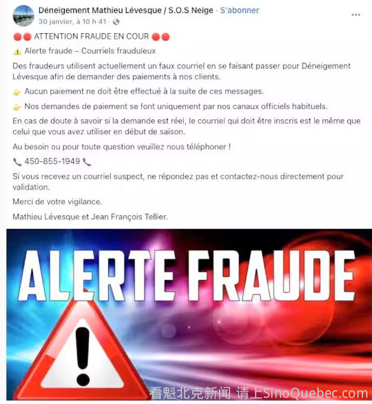 过去一周,魁北克省多地的数十家除雪承包商报警,称诈骗分子向其客户发送虚假的逾期付款账单。 诈骗邮件高度仿真,完整复制除雪合同内容,掌握客户的姓名、地址、电话及真实合同编号,并要求通过 Interac 转账至与公司邮箱几乎相同的地址,仅多一个字母。 目前,全省已有 40 多家除雪公司受影响,范围涵盖 Lévis、Saint-Hyacinthe、Chicoutimi、Boucherville、Sept-Îles 等地。 诈骗分子选择在 1 月中旬下手,正值客户支付第二笔除雪费用的时间。 涉事企业纷纷通过社交媒体提醒客户提高警惕。除雪行业常用软件 Follosoft 表示,其系统未发现任何入侵或数据泄露。 业内提醒,如收到付款提醒,应先直接联系除雪承包商核实,切勿贸然转账。