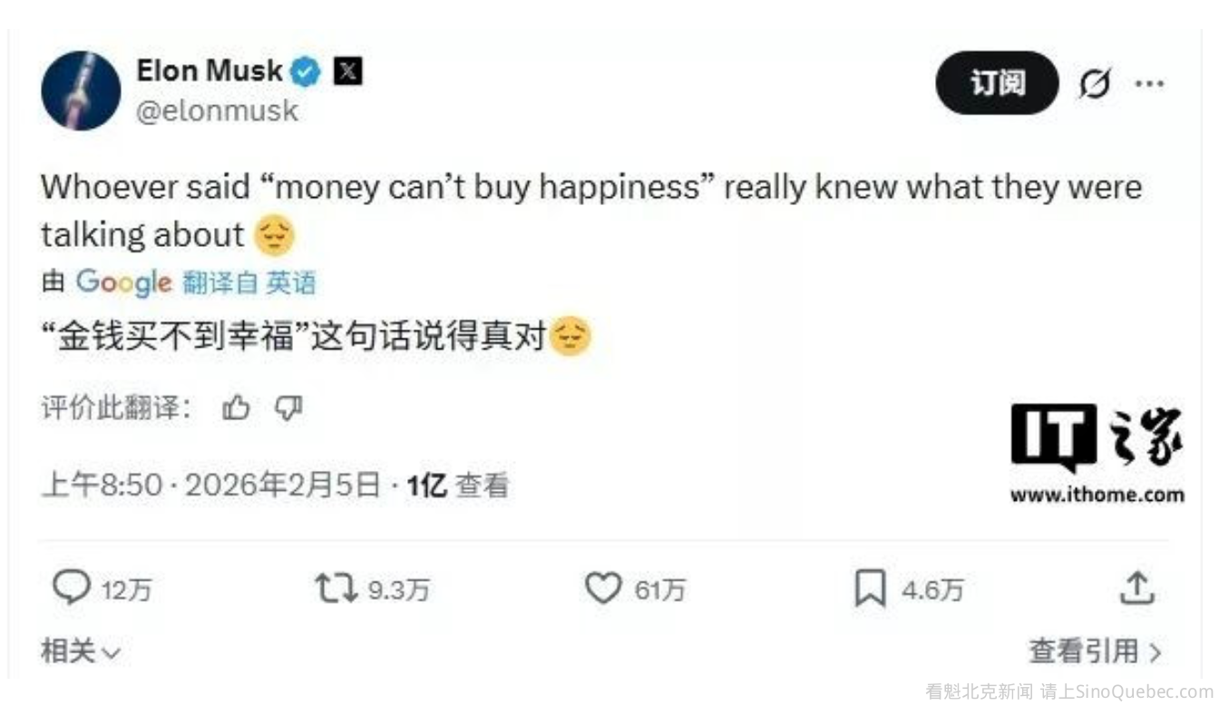 IT之家 2 月 7 日消息,身价超 8000 亿美元的世界首富马斯克本周四在 X 上发帖,称“‘金钱买不到幸福’这句话说得真是太对了”,遂引发大量关注与讨论。目前这条帖子的浏览量已超过 1 亿次。 这一言论在 X 上引发了广泛的反响,其中包括一些曾面临同样困境的超级富豪。对冲基金亿万富翁比尔 · 阿克曼表示,“很多幸福都源于帮助他人。你已经帮助了数百万人,未来很可能会达到数十亿人。你只需要珍惜你为这么多人所取得的成就就好。” 阿克曼还表示,或许马斯克该找一位长期伴侣安定下来,“幸福也可能源于与某个特别之人所建立的长久关系。是时候去寻觅那个能与你长久相伴的人了。这只是我的一点小小的建议。” 亿万富翁、前《创智赢家》(Shark Tank)明星马克 · 库班(Mark Cuban)表示,财富与幸福之间的联系并不是“非黑即白”的。本质上,金钱并不会决定是否幸福,更多的只是放大已有的幸福感。 “如果你没钱的时候保持积极的心态,那么当你暴富之后也会感到无比快乐。而如果你没钱的时候就很痛苦,那么你依然会感到痛苦,只是经济压力会小很多。” 对于马斯克这条帖文,X 上的评论“褒贬不一”。除支持者外还存在大量批评者。作家 Derek Guy 写道:“如果我们想最大化幸福,这是否意味着我们应该把财富从亿万富翁手中重新分配给贫穷和生病的人?对他们来说,这些资源可能可以挽救生命,比如以对贫穷国家的人道主义援助形式。” 作者 Maddox 评论称:“你觉得这是否与这样一个事实有关:你所做的一切就是向世界释放仇恨与负面情绪,而它将不断反弹回你身上?” “金钱买不到幸福”这一说法长期存在于西方文化语境中,被认为可追溯至 18 世纪哲学家卢梭。其含义通常被解释为:金钱可以带来舒适与安全感,但无法保证真正的幸福、满足或情绪健康,这些更多来自人际关系、人生目标与内心平静等非物质因素。 值得一提的是,马斯克近期因 SpaceX 与 xAI 的合并而成为首位身家达到 8000 亿美元的人,并被认为有望成为首位“万亿美元富豪”。 另外,马斯克近年来不仅因商业活动频繁登上新闻,也因其复杂的家庭生活持续引发外界关注,包括与多位伴侣育有十多个孩子,并涉及重组家庭、监护权争议以及围绕育儿与隐私的公开分歧。 此外,马斯克最近还因为与杰弗里 · 爱泼斯坦案存在牵扯而备受争议。美国司法部公开的文件似乎显示爱泼斯坦与马斯克在 2012 年至 2014 年间曾有通信往来。不过,马斯克多年来一直否认曾前往爱泼斯坦的私人岛屿,并在此前一条帖文中写道,爱泼斯坦曾“试图让我去他的岛上,但我拒绝了”。 在这批文件公布后,马斯克上周六在 X 上发帖称:“我与爱泼斯坦的通信非常少,并拒绝了他反复邀请我去他的岛或乘坐他的‘萝莉塔快车’,但我很清楚,与他的一些电子邮件通信可能会被误读,并被对手用来抹黑我的名声。” IT之家注:“萝莉塔快车”(Lolita Express)是爱泼斯坦曾拥有的一架私人波音 727 飞机的外号,因相关调查、法庭文件、飞行记录与幸存者证词而成为该丑闻的象征。 |