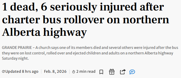 在刚刚过去的周末,加拿大发生一起令人痛心的严重交通事故。一辆载有37名乘客的巴士在高速公路上失控翻车,多名成人和儿童被甩出车外,造成1人死亡、22人受伤,其中6人伤势严重。 ![]() ![]() 图源:global news 据加拿大皇家骑警(RCMP)通报,事故发生在周六(2月7日)晚上10:30至11:45之间,地点位于阿尔伯塔省Debolt以西的43号高速公路。 警方初步调查发现,事发时巴士在靠近高速出口处尝试变道,但因路面结冰失去控制,先撞上中央隔离带,随后翻滚一次,最终四轮朝下停在路面上。车上共有37名成人和儿童,全部来自大草原城基督复临安息日会教会(Grande Prairie Seventh-day Adventist Church)。 事故造成一名50岁女子当场身亡,另有6人伤势严重被紧急送医,16人被评估为轻伤并已出院。 其余未受伤的乘客被转送至距离事故现场约60公里的Debolt消防局,在那里取暖并接受临时安置。 教会牧师Dan Wilson周日在声明中确认,遇难者为Lillian Banda,是教会活动中的一名领队。她在事故中被甩出车外,不幸当场身亡。 ![]() 图源:https://atoday.org/ Wilson描述了事故发生后的混乱与无助:“事故发生时环境‘黑暗而寒冷’,成员们在现场尽力彼此帮助。”他提到,是一名孩子找到了一部手机并拨打911报警。 Wilson透露,目前教会成员要么已回到家中休养,要么仍在医院接受治疗。 谈及伤者情况,Wilson表示:“有些人需要接合断骨,而所有人的心灵都需要疗愈。我可以近乎百分之百地肯定,目前医院里的伤者都没有生命危险,也不会留下严重的永久性伤害。” 事故发生后,教会迅速为社区提供牧师和心理辅导支持,并于周日晚间举行祈祷仪式,向信众通报最新情况。 Wilson还透露,有两名仍在住院的伤者来自牙买加,不久前才加入教会,她们的女儿目前暂住在他家中。 此外,他也特别呼吁大家为巴士司机祈祷。他回忆称,事故当晚在Debolt消防局见到司机时,“他独自坐着,低着头,深受打击”。第二天早上,Wilson在医院离开时再次与司机交谈,“他为发生的一切而感到崩溃,也需要我们的祈祷”。 RCMP初步调查认为,恶劣路况可能是导致事故的重要因素。碰撞重建专家已到场勘查,调查仍在进行中。 事故发生后,43号高速公路一度封闭,以配合现场勘查,并已于周日早晨全面恢复通车。 |