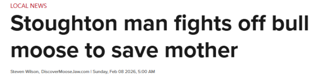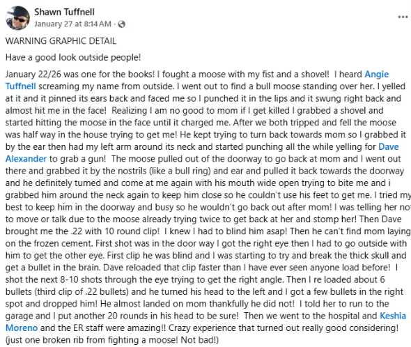 在萨斯喀彻温省比安费特(Bienfait),当天的体感温度接近零下40度。安吉·塔夫内尔像往常一样走出家门,准备启动汽车,一切看似和平常没什么不同——直到意外发生。 “我听到她在喊救命,”她的儿子肖恩·塔夫内尔(Shawn Tuffnell)说,“我一路冲下楼……看到的画面是一只麋鹿站在她身上。”这只麋鹿又冷又饿,蜷缩在房屋外墙旁,紧贴着烘干机排气口取暖。 没过多久,它就向安吉发起了攻击。混乱的搏斗随即展开,肖恩决定正面迎上这只动物——真的是“正面”。“我第一反应——说实话根本没多想——就是走出去,直接一拳打在它脸上,”肖恩在接受CBC《The 306》节目采访时说。 ![]() ![]() 图源:Shawn Tuffnell's Facebook post 这一拳把麋鹿的嘴唇打裂了,但并没有把它吓退。麋鹿随即猛扑过来,几乎擦着肖恩的脸冲过去。肖恩抓起一把铁锹,连续敲了麋鹿三下,但它依然没有停下。 当肖恩往屋里退时,麋鹿竟然跟了上来,前半个身体硬生生挤进了门框。“它几乎已经站在屋里的地板上了……想抓我,”肖恩说。 当麋鹿再次转向仍被压在冰冻地面上的母亲时,肖恩一把抓住它的耳朵和鼻孔,把它勒进“锁喉”姿势,用自己的腹部顶住它的下颚,防止被咬,同时借助门框挡住麋鹿的蹄子。 “我根本不在乎它对我做了什么,”他说,“我脑子里只有一个念头——想办法让它看不见她。” 耐冻的麋鹿也扛不住如此极寒这场惊魂经历,直到安吉的男友终于拿来一支.22英寸(5.6毫米)口径步枪才结束。肖恩接过枪,朝麋鹿连开数枪。他先朝麋鹿的眼睛开枪,阻止它继续盯着母亲,然后重新上膛。“大概打了15发左右吧,最后终于把它放倒了,”肖恩说。 ![]() 图源:Shawn Tuffnell's Facebook post 随后,加拿大野生动物健康合作组织(Canadian Wildlife Health Cooperative)对麋鹿进行了尸检,确认它死于“头部多处枪伤”,其中一发子弹最终穿透大脑。尸检结果也证实了肖恩的判断:这只麋鹿极度虚弱。 报告指出,它体内“已经没有任何脂肪储备。”它并没有感染狂犬病或慢性消耗性疾病,只是单纯地又饿又冷,在寻找热源。“它是真的饿坏了,”肖恩说,“它也是在求生。” ![]() 图源:Shawn Tuffnell's Facebook post 萨省大学(University of Saskatchewan)教授、麋鹿研究专家瑞安·布鲁克(Ryan Brook)表示,虽然这次袭击令人震惊,但在极端天气下,这种行为其实可以理解。 “麋鹿适应寒冷环境,但零下50度对任何生物来说都太极端了,”布鲁克说,“它们的行为非常不可预测,可能前一秒还很平静,下一秒就突然冲锋。” 麋鹿活动范围已至萨省农田社区安全厅(Ministry of Community Safety)在一份声明中提醒公众要与野生动物保持距离,但布鲁克指出,所谓的“距离”,如今正变得越来越难以实现。在过去50年里,麋鹿的活动范围已经扩展到了萨省大量农田地区。“ 在萨省,每个人其实都生活在麋鹿的栖息地里,”布鲁克说。 这次遭遇,给塔夫内尔一家留下了身体和心理上的创伤。安吉的腿部被麋鹿踩伤,小腿有一道很深的伤口,目前正在恢复中;肖恩则肋骨骨裂,头上还肿起了一个很大的“鹅蛋包”,直到几个小时后肾上腺素消退,他才意识到自己受了伤。 ![]() 图源:Shawn Tuffnell's Facebook post 我并不乐意猎杀这头麋鹿,”他说。“但当时只要我们和它都还活着……那么这件事就非做不可了。” |