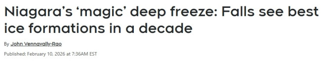 寒风刺骨也拦不住好奇心,近日游客们纷纷赶到尼亚加拉瀑布,目睹十年难遇的冰封画面。 来自安省伦敦的Gil和Dana Mariano形容这一幕“美得惊人”,“难以置信”。 “你当然会讨厌这样的天气,”Gil谈到严寒时说,“但你也必须从中发现美,所以我们开了两个小时的车专门来看这一幕。” “这简直像魔法。那种半冻结的状态,真的太酷了,”他补充道。 ![]() ![]() 图源:Niagara Parks Commission 在瀑布周围,随处可见巨大的冰层堆积,尤其是在美国瀑布底部形成的巨型冰丘。这种景象并非每年都会出现,而这是自2015年以来人们见过冰量最多的一次。 Niagara Parks Commission首席执行官David Adames表示:“我们看到的是至少十年来最好的冰封景观。” 这完全是这个寒冷冬季以及极地涡旋带来持续数周极端低温的结果。 “昨晚气温达到零下20度,”Adames说,“这样的条件正是我们现在看到景象的原因。” ![]() ![]() 图源:CTV News 瀑布本身并未完全冻结。冬季每分钟仍有约8500万升水流经尼亚加拉瀑布,这样的水量不可能完全结冰。 不过,历史上确实发生过一次完全冻结——1848年,由于冰塞阻断水流,瀑布曾停止流动超过30小时。 19世纪末的一张照片显示,人们曾站在临时形成的冰桥上,这座冰桥可连接加美两国。由于1912年发生致命坍塌事故,此后便禁止人们在冰桥上行走。 ![]() 图源:Niagara Parks Commission 来自安省Oshawa的John和Jade Sharko专程驱车前来,观看这半冰封的瀑布以及下方连接加美的临时冰桥。 “树木和周围的一切都被冰包裹,真的太美了,”Jade说。 John则表示,相比夏天的人山人海,他反而喜欢现在游客不算太多的氛围,而且并不介意寒冷。 “非常值得,”他说,“只要穿对衣服,一切都很好。” 虽然周二气温升至1°C,但由于已经形成大量冰层,Adames表示这些冰景可能会持续数月。 “随着家庭日长周末临近,这是观赏瀑布的绝佳时机。” |