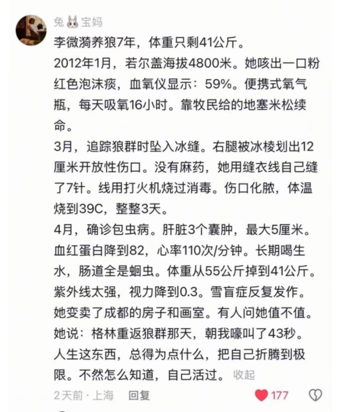 ![]() 时隔9年,纪录片《重返狼群》翻红,全网哭声一片。故事并不复杂,人类妈妈李微漪,亲手养大了父母双亡的草原狼格林,又成功将它送回狼群。 当年没能发出太大声响的故事,在这个冬天掀起滔天巨浪。狼妈李微漪手写长文,宣布影片将在春节重映,却也直言不讳,“这泼天的流量微漪并不想接”。 ![]() 这并不奇怪。九年前纪录片第一次上映时,与哭声同时到达的就是骂声。有人骂影像镜头粗糙,有人喷刻意煽情,还有人指责李微漪炒作赚钱,就连她的假睫毛都被嘲讽了一波。 格林的故事再次爆火,二创视频、歌曲、画作,甚至价格不菲的商场巨幅广告涌现,但诋毁声更甚,骂李微漪自导自演、目的不纯,利用格林手段残忍。作为事件的中心,李微漪正在经历一场“以爱为名”的网暴。 人类不断侵犯自然的边界,有利益的地方就有杀戮,但世界破破烂烂总有人缝缝补补。 在这条艰辛的路上,李微漪并非第一个被围剿的女性,也不会是最后一个。然而,面对非议和坎坷,她们总有一股力量可以战胜万难。这种力量包容、强大而原始,让人想到人类失去已久的“自然母亲”。 ![]() ![]() 走红的格林,被网暴的李微漪 格林实在是一匹太不普通的狼,父亲是狼王,为了挣脱捕兽夹自断前腿,正面顽抗到生命最后一秒;母亲也是狼王,吃下毒饵殉情,死前咬烂皮毛不让猎人得逞。格林作为唯一存活的幼崽,被李微漪救助到城市,又带回若尔盖草原放归。 这个过程中,格林有太多高光时刻:几只藏獒为挨打的它冲锋陷阵,它便守在受重伤的藏獒黑虎身边七天七夜舔舐伤口;自己在冰天雪地饿肚子,还给肺水肿的李微漪猎兔子;李微漪扭伤脚后,格林翻山越岭牵来一匹马;惜别时,它舔舐人类母亲的眼泪,一步三回头;全身上下没有一个口袋,却把李微漪的红绸带珍藏七年...... ![]() 种种细节推翻了大众对狼的刻板印象:什么狼子野心、狼心狗肺、白眼狼?我们在格林的身上看到了仁义、忠孝。用李微漪的话来说,人比狼高级,但狼比人高贵。 纪录片火了,格林如同被活佛祝福的那样被很多人爱着,同时也引来不速之客。有人去大草原找狼洞直播,有人想在若尔盖建农家乐,有人企图跟风养狼或捷克狼犬复制神话...... ![]() 人们为了流量打扰大自然的宁静,同时也将低调生活的李微漪推上网络舆论的风口浪尖。 有人质疑李微漪讲述的真实性,说“区区几条狼跟随不算狼王”、“格林经常回小木屋,它肯定没被狼群接受、“假狼拍摄,前后两只狼长的不一样”。 面对种种猜测和质疑,李微漪没有出面澄清和反驳,但谣言不攻自破。 首先,在过度放牧沙化的草原上,野生狼的栖息地越来越局限,狼群数量也逐渐减少,格林领导几只狼寻找食物和水源、拥有交配权和后代,确实算当过狼王。 其次,“没被狼群接受”的指责也站不住脚。当年李微漪为了寻找狼群,和搭档亦风将小木屋搭建在山区深处,所在地本来就是狼群的活跃范围。狼群在冬季会因食物匮乏打围捕猎,在夏季各自行动单兵作战,所以在小木屋观测到格林独自徘徊并不能说明问题。 还有外表的质疑。纪录片中确实用格林的孩子福仔为格林补拍儿时镜头,但绝不是换了一匹成年狼“摆拍”。养宠人都知道动物的毛色可能会因为年龄变化而变化,何况仔细分辨就能看出格林标志性的“天眼”。 ![]() 有人攻击李微漪“写书赚钱,自私虚假”、“有这个时间怎么不回草原多看看狼儿子”? “炒作赚钱”是一种污名化。在情绪必须变现、热度必须榨干的时代,泼天的流量来了,她说不接就不接,不直播也不卖货,留下一句“格林的故事已经说完了”便消失在自驾的途中。或许李微漪当下的沉默正是最好的人格背书。 此外,还有许多人认为格林不想自由,它想留在妈妈身边,李用放归做借口“弃养”了格林。 网友到底想要什么样的结局? 有人建议把格林带回农村老家,有人建议给格林包个山头,有人让格林在扎西牧场做赶羊狼,更有甚者,让李长期定居狼山给格林养老,干脆也跟着格林回归狼群...... 李微漪正在经历一场“以爱为名”的网暴。在“如果是我,我会怎么样”的嘴炮背后,不是真正的爱,而是过度代入人类感情,忽视狼的野性和现实的复杂。 网友的假想都是伪命题,而李的付出和努力却是真切的。她不仅救了一只格林,还推动建立起第一个中国狼生态保护监测站。 2013年,李微漪得知放归的格林可能被人捉走,她卖房重回狼山。一次记者问养格林花了多少钱,她只是轻描淡写道“谁家养孩子还算花销的”。 ![]() 盗猎者的猖狂来源于系统性的漏洞,个体的力量终归是有限的,李已经做到了普通人望尘莫及的程度。 隔着屏幕轻飘飘一句“养一辈子”谁都能说,但面对高原反应、食物短缺,多少人能坚持住?现代人连半天上不了网都难以忍受,更别提在如此恶劣的生存条件下长住,甚至还要面临盗猎者的死亡威胁。 不要说陪着格林在草原一辈子,格林小时候在家乱拉乱尿、半夜狼嚎拆家的时候,那些键盘侠可能早就把它送走了。 然而,针对李微漪的口诛笔伐并没有停止,似乎被误解就是表达者的宿命。 ![]() 使命必达的“母亲们” 在动物保护这条艰辛的路上,李微漪并非第一个奔走疾呼的勇士,也并非第一个被舆论围剿的女性,人们总说“你做的不对”,“你做的不够多”,“你做的太迟了”......甚至,死亡威胁。 西高地犬papi的妈妈Penny裸辞自学刑法,依法上诉,与投