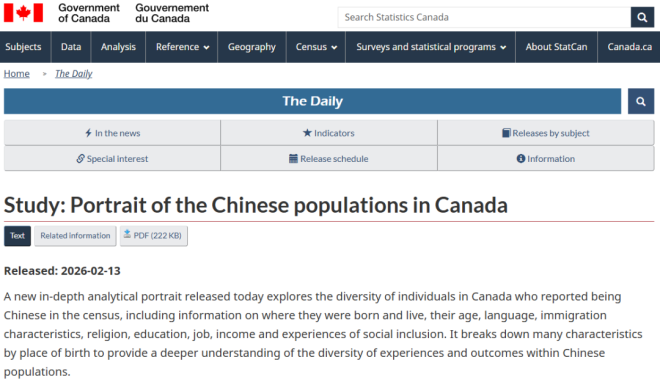 换句话说,华人收入分布更呈现“两头多、中间少”的特点。其他族群并没有出现这种分布模式。 报告还显示,与非种族化非原住民群体相比,华人更有可能处于“几乎没有税后调整收入”(低于2,500加元)的状态。 这类人群大多数的经济家庭收入在0至2,499加元之间(而不是负收入)。共有50,010名华人处于这种情况。 加拿大华人值得骄傲这篇报告是加拿大统计局为支持加拿大“反种族主义战略”而推出的一系列种族化群体专题报告中的一份。本次发布的分析内容,除特别说明外,均基于2021年加拿大人口普查数据。 综合这些数据可以看出,加拿大华人群体是一支高度投入、教育水平高、经济参与度强的力量。无论是在多伦多、温哥华等核心城市的发展中,还是在专业领域、创业投资和社区建设方面,华人都发挥着实实在在的作用。 即使面对语言挑战、学历认证障碍以及歧视压力,整体上依然保持较高的受教育水平、较强的置业能力和稳定的社会参与度。这种在逆境中扎根、在多元社会中持续创造价值的能力,本身就是值得肯定和自豪的地方。华人在加拿大的故事,不只是奋斗史,更是一种韧性与责任感的体现。 完整报告链接如下:(有HTML和PDF版本) https://www150.statcan.gc.ca/n1/en/catalogue/89-657-X2026001 |