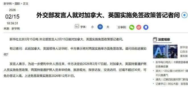 加拿大护照持有人即将迎来一个重要利好消息。 中国外交部发言人日前宣布,自本周二(2月17号)起,加拿大公民可免签入境中国,停留时间最长30天。该政策适用于商务、旅游、探亲访友、交流访问以及过境等多种目的,有效期至2026年12月31日。这意味着,在未来近两年时间里,加拿大护照持有人前往中国将更加便利,不再需要提前申请签证、准备繁琐材料或支付大约140加元的签证费用。 中国外交部在官网发布声明称,加拿大护照持有人将被“免除签证要求”,最长可停留30天。同样享受这一待遇的还包括英国护照持有人。加拿大外交部长 Anita Anand 随后在社交媒体上确认了这一政策,并表示这一变化将“让旅行更加便捷,促进商务往来,加强两国人民之间的联系”。 ![]() 事实上,这一免签安排早有迹象。今年1月,加拿大总理 Mark Carney 访问北京,并与习近平主席会面。当时,总理办公室发布声明称,卡尼欢迎中方承诺为加拿大赴华旅客引入免签政策。虽然当时中国官方并未正式确认,但如今政策落地,显示双方关系确实出现回暖迹象。 ![]() 在过去几年中,由于一系列外交摩擦,中加关系一度紧张。北京方面不仅维持对加拿大公民的签证要求,还曾限制中国赴加拿大的旅游团数量。与此同时,加拿大企业和农业出口也受到不同程度影响。 值得注意的是,此次关系缓和并非单一举措。今年早些时候,在卡尼访华之后,加拿大与中国达成一项贸易安排:允许数以万计的中国电动车进入加拿大市场,同时中方在一定程度上放宽对加拿大农产品(例如油菜籽)的关税限制。这一互相让步被视为双方改善经贸关系的重要信号。 ![]() 从实际操作层面来看,此次免签政策对普通加拿大旅客意义重大。此前,加拿大公民前往中国大陆需要提前在线填写申请、预约签证中心、提交材料、录入指纹,并支付约140加元费用,整个流程往往耗时数周。对临时出差或计划短期探亲的人来说,并不方便。如今免签30天,不仅节省时间和金钱,也为商务往来、短期考察以及家庭团聚创造了更多灵活空间。 这项政策也被认为是中国在疫情后持续推动旅游复苏的一部分。自新冠疫情结束后,中国陆续对多个西方国家实施单方面免签或扩大免签范围,以吸引国际游客、恢复航班和刺激消费。旅游、酒店、航空及会展行业都被寄予厚望,希望通过签证便利化带动更多人流与资金流。 对于加拿大而言,这一举措同样具有现实意义。近年来,加拿大企业希望重返中国市场,但在签证政策、政治氛围和市场信心等因素影响下,商务交流一度受限。免签政策落地后,商务考察、供应链沟通以及教育文化交流都将更加便利。尤其是留学生家庭、跨国家庭以及在华有商业合作的中小企业主,都会直接受益。 ![]() 当然,政策虽为利好,但也有几点需要注意。第一,免签停留期为30天,若计划停留更长时间,仍需依法申请相应签证。第二,免签适用于商务、旅游、探亲、交流和过境等常规短期目的,不包括在华就业或长期居留。第三,具体入境规定仍需以中国海关及出入境管理部门的最终解释为准。 ![]() 综合来看,加拿大公民赴华免签,是中加关系“破冰”后的又一实质性成果。从外交层面看,这是双方释放善意、重建互信的重要一步;从民间层面看,则让普通旅客真正感受到便利。未来两年内,随着航班恢复、商务往来增加以及旅游市场回暖,中加之间的人员流动有望明显上升。 对于有计划回国探亲、旅游或考察市场的加拿大华人来说,现在无疑是一个更轻松的窗口期。接下来,就看两国能否在此基础上继续推进更多务实合作,让“免签”不只是一次政策调整,而是关系回暖的长期趋势。 |