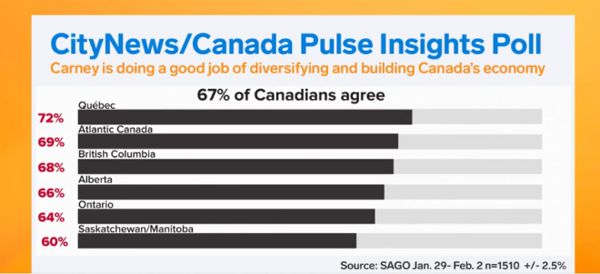 一项最新民调发现,三分之二的加拿大人坚定支持总理卡尼推动加拿大经济转型的努力,试图摆脱受特朗普关税影响的经济模式,转向新的机会和发展方向。同一项民调还发现,加拿大人对他推进各省和地区基础设施建设的速度仍保持耐心,并对他在国际舞台上的领导力感到鼓舞。 ![]() 图源:globalnews CityNews/Canada Pulse Insights民调显示,67%的受访者认为总理在推动加拿大经济多元化和建设方面做得很好。其中支持率最高的是魁北克(72%),其次是大西洋省份(69%)和卑诗省(68%)。 有趣的是,即使在过去对自由党支持度不高的地区,也出现了类似的强劲支持率。66%的阿尔伯塔省受访者以及60%的萨斯喀彻温省和曼尼托巴省受访者认同总理的做法。 ![]() Canada Pulse Insights首席执行官John Wright表示:“我在这个国家做了37年的民调,尤其是在过去25年里,很少看到自由党在传统保守派地区能取得如此高的支持率。” “更令人着迷的是,即使是准备在下次选举中投票给保守党的选民,他们实际上也很欣赏这位总理。我认为这是因为卡尼展现出了一种偏中右翼的施政方式。” 回应各省需求三分之二的加拿大人认为卡尼正在倾听各省省长的意见,并提供他们省份或地区所需的政策支持。 类似比例(63%)的受访者对总理目前推进基础设施项目的速度感到满意,并表示“这些事情需要时间”。 Wright解释说:“尽管反对党一直在问‘项目在哪里’、‘什么时候动工’,但三分之二的民众愿意给他时间。” “他担任总理大约一年,但已经完成了一些关键步骤。这不仅仅是签协议,而是推动他所提出的愿景,并倾听需要完成的事情。” ![]() 图源:CTV 国际领导力获得高度评价在国际舞台表现方面,卡尼同样获得高度评价。 七成加拿大人表示,他们为卡尼代表加拿大参与国际事务感到自豪,尤其是在他上个月于瑞士达沃斯世界经济论坛发表演讲之后。 虽然他在1月20日对全球领导人的讲话遭到美国总统特朗普直接批评,但却在国际和国内广泛获得赞扬。 Wright表示:“加拿大人希望有一位成熟的领导人,不仅能应对特朗普,也能与世界领导人沟通合作,帮助加拿大完成经济调整。” “现实是,加拿大人感觉很好,因为他们有一位不仅为他们工作,而且知道如何在国际舞台上完成事情的领导人。” 生活成本问题或成最大弱点虽然数据显示,55岁以上选民和年轻人对卡尼的经济管理评价最高,但35至54岁群体则明显更为怀疑。 ![]() 图源:CPAC 他们认为政府没有充分倾听他们的声音,也没有提供足够帮助,这显示生活成本问题可能成为政府的最大弱点。 在可负担性问题上,整体态度仍偏正面,尤其是魁北克,61%的受访者支持政府做法。 但越往西支持率越低: • 阿尔伯塔省:51%支持 Wright总结说:“在所有经济指标上,全国三分之二的民众都在说,你做得很好。” “总体来看,这是一个从东到西再到北都非常惊人的支持率,特别是在魁北克和阿尔伯塔这些具有政治争议的地区,总理获得的支持非常高。” |