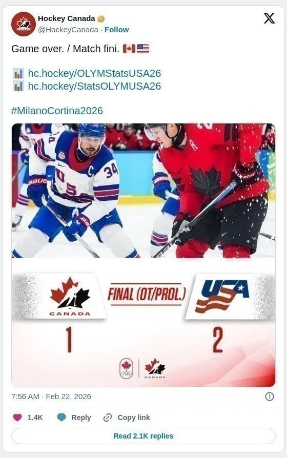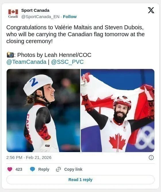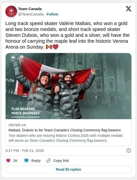 今日,2026年冬奥会闭幕式点亮历史悠久的维罗纳竞技场,标志着为期17天的冬奥会圆满结束。 2026 年米兰-科尔蒂纳冬奥会正式落下帷幕,并创造了又一个奥运历史:闭幕式在联合国教科文组织世界遗产地内举行。 在米兰和科尔蒂纳丹佩佐的两个圣火盆熄灭后,奥林匹克会旗将降下并移交给2030年冬季奥运会主办国法国。 闭幕式还包括奥运会最后一个项目的颁奖仪式:女子和男子越野滑雪 50 公里古典式集体出发。 今日举行的2026年奥运会闭幕式上,加拿大速滑运动员瓦莱丽·马尔泰斯(Valérie Maltais)和短道速滑运动员史蒂文·杜波依斯(Steven Dubois),在奥运会闭幕式上担任加拿大代表团旗手。 ![]() 周六,这两名魁北克运动员被任命为加拿大代表团在意大利维罗纳举行的米兰-科尔蒂纳冬季奥运会闭幕式上的旗手。三枚奖牌得主瓦莱丽·马尔泰斯和短道速滑冠军史蒂文·杜波依斯,带领加拿大参加闭幕式。 ![]() ![]() 杜波伊斯在男子 500 米比赛中获得金牌,并且是获得银牌的混合接力队成员之一。 “我真的很想享受这次经历,也想获得奖牌,我觉得两者都做到了”,这位留着胡子的28岁选手说道。“我确实做到了这两点,能有机会代表国家、举起国旗,对我来说简直是梦寐以求的机会。我真的完全没想到会这样”。 ![]() 三枚奖牌得主马尔泰斯帮助加拿大队与伊万妮·布隆丁和伊莎贝尔·魏德曼一起卫冕了奥运会女子团体追逐赛冠军。 马尔泰斯还在 3000 米和 1500 米比赛中获得铜牌。 “我首先想到的是,这该如何为我的奥运之旅画上一个圆满的句号呢?”马尔泰斯说道。“我玩得很开心,我充满激情地滑冰,我非常兴奋能与加拿大分享这一切”。 这位来自魁北克省拉贝的35岁选手参加了她的第五届也是最后一届奥运会。她职业生涯共获得五枚奖牌,其中包括2014年短道接力赛的奖牌,之后她转战长道。 ![]() 来自魁北克省特雷博内的杜波依斯在其职业生涯中也获得了五枚奥运奖牌,其中包括2022年帮助男子接力队取得胜利时获得的金牌、银牌和铜牌。 马尔泰斯与她的丈夫乔丹·贝尔乔斯(一位参加过 2018 年冬季奥运会的速滑运动员)讨论了成为一名奥运选手意味着什么,“成为奥运选手有两种愿景”,她说,“一种是专注于整个过程,全身心投入到比赛中,并尽力发挥;另一种是敢于梦想伟大”。 马尔泰斯打算在退役前再参加一个赛季的速滑比赛。她希望继续从事体育相关工作,或许会担任教练,同时她也想完成大学学业。 杜波伊斯接过枫叶旗,让他终于成为众人瞩目的焦点。他的队友查尔斯·哈默林曾是北京奥运会短道速滑明星。 “终于获得这样的认可,感觉真好”,杜波伊斯说,“我觉得在北京的时候,我差点就当上了旗手,当时没能获得这个机会,我真的很失望。但在这里获得这个荣誉,虽然过程充满起伏,但我觉得这让它显得格外特别和真实”。 “我现在无比享受这一切”。 加拿大在此次冬奥会上共获得21枚奖牌:5枚金牌、7枚银牌和9枚铜牌,排在奖牌榜第 11 位。 ![]() 加国队痛失金牌 美国赢46年首枚冰球金牌 周日,在意大利米兰举行的2026年冬季奥运会男子冰球金牌争夺战中,美国队在加时赛战胜加拿大队庆祝胜利。整整46年后美国男子冰球队自冰上奇迹以来首次夺得金牌。 ![]() 加拿大男子冰球再次痛失2026冬季奥运会金牌,前两天,加拿大女子冰球队也是不敌美国队,获得2026冬季奥运会银牌。 ![]() 美国时隔 46 年再次夺得奥运会男子冰球金牌,这也是美国历史上第三次获得该项荣誉。 周日,杰克·休斯在加时赛中打入制胜球,帮助美国队以 2-1 战胜加拿大队。 ![]() 美国男子冰球队上一次获得奥运金牌是在 1980 年,当时“冰上奇迹”队在普莱西德湖取得了胜利。 金牌争夺战经过三轮比拼双方战成 1-1 平,进入加时赛,体育馆内的气氛十分紧张。前三节比赛过后,加拿大队和美国队的射门数为 41 比 26 。 两队进行 3 对 3 的加时比赛,直到有人得分为止。 ![]() 加拿大守门员乔丹·宾宁顿在美国队强打时做出了几次关键扑救,然后美国前锋杰克·休斯高杆击打加拿大前锋博·霍瓦特,结束了美国队的强打机会。 加拿大队也曾获得几次机会,包括一次 70 秒的强打,但他们未能把握住机会,60 分钟后比分仍为 1-1。 杰克·休斯在加时赛开始不到两分钟就进球,帮助美国队以 2-1 战胜加拿大队,美国队也因此获得了自 1980 年以来男子冰球的第一枚奥运金牌。 加拿大自 2002 年以来第四次闯入男子冰球金牌争夺战,但自 1998 年 NHL 球员获准参加奥运会以来,他们首次只能屈居亚军。 自1998年NHL球员开始参加奥运会以来,加拿大队一直占据着这场宿敌之战的主导地位。加拿大队在2002年和2010年冬奥会的决赛中击败美国队,并在2014年冬奥会半决赛中零封美国队。 虽然美国队在去年的四国对抗赛循环赛中战胜过加拿大队,但在关键时刻,美国队再次败北。 美国和加拿大之间的巅峰对决一直是本届冬奥会最引人瞩目的潜在对决,但这两支冰球强队都未能轻松晋级金牌争夺战。 美国队凭借奎因·休斯在加时赛中的制胜球才在四分之一决赛中险胜瑞典队。加拿大队则在四分之一决赛对阵捷克队和半决赛对阵芬兰队的比赛中,均在第三节落后的情况下上演逆转好戏。 最终,这场冰球界翘首以盼十二年的奥运金牌争夺战得以上演。 特朗普称赞美国赢得奥运金牌 美国总统唐纳德·特朗普在 Truth Social 上分享了