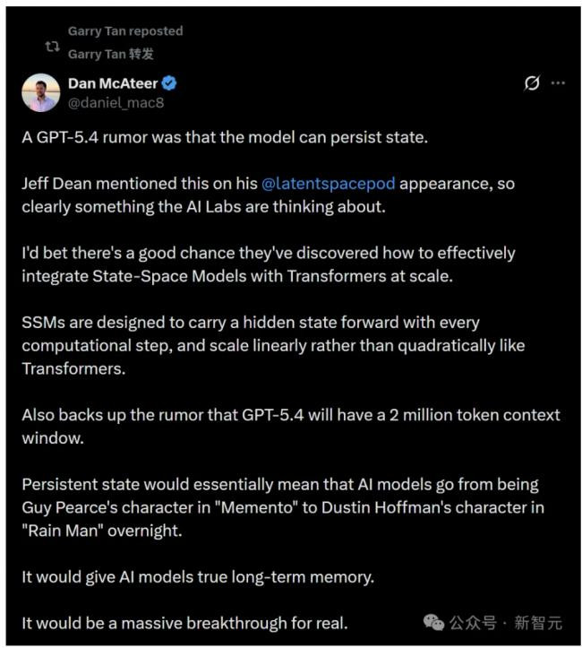 多方消息证实,OpenAI正在密集测试GPT-5.4。相比前代,该模型或迎来多项重大升级:上下文窗口翻倍至100万tokens,新增极限推理模式以应对复杂问题,长期任务执行能力显著提升。 最炸裂的传闻是,GPT-5.4可能引入永久记忆功能,让AI真正拥有持续记忆能力。若属实,这将是向自主智能体演进的关键一跃。 如果你觉得最近AI圈有点安静,太不刺激,那可能只是暴风雨前的宁静。 据多方消息,GPT-5.4,已经箭在弦上了! LMArena上,已经出现了GPT-5.4的身影。 就在刚刚,外媒The Information,剧透了不少关于GPT-5.4的核心内幕。 消息足够炸裂:它有更长的上下文,更极限的推理模型,甚至,可能出现永久记忆! 如果如传闻所言,这些都是真的,那这一代模型很可能不是简单的升级,而是一次能力形态的巨大跃迁。 ![]() ![]() ![]() GPT-5.4提前测试,代码炸裂曝光 最近,GPT-5.4简直在到处泄露。 ![]() 从Codex错误日志、GitHub PR,到员工误发截图,短短几天时间,GPT-5.4已经被“曝光”了至少三次。 ![]() 而且,这还都是OpenAI自己意外泄露出来的。 最早,是开发者Corey Noles在使用OpenAI Codex时触发了一次网络安全限制,系统返回的错误日志里出现了一串非常长的模型名称: ![]() 这串字符最关键的,就是前面三位——gpt-5.4。 总之,这串字符串可以认为是OpenAI的内部部署ID,翻译过来就是“一个真实部署、正在测试中的GPT-5.4实验版本。” ![]() 然后,在OpenAI官方Codex仓库里,出现了两个Pull Request: 一个PR写着: ![]() 另一个PR更直接: ![]() 看起来,OpenAI给GPT-5.4加了一个“Fast Mode”开关。几小时后,两个PR就被force push删除了。 接下来,更戏剧性的一幕出现:OpenAI Codex团队的一名员工Tibo 在社交平台上发布了一张截图。图中,模型选择器里赫然写着GPT-5.4。 ![]() 没多久,这条帖子就被删掉了。 随后,又有开发者报告,在Codex错误信息中看到类似的模型字符串。 这更加说明,GPT-5.4已经部署在内部服务器,正在进行真实的A/B测试了。 一次提示,生成6000行代码? 而且,目前已经有开发者报告了一个明显变化——速度! 一些测试者表示,模型的推理明显更快,代码生成更长,甚至一次提示可生成 6000+行代码! ![]() 这在以前几乎不可能。 一些人还发现一个新特征——Fast Mode。 这可能意味着,OpenAI正在尝试新的推理架构,例如多级latency pipeline,或不同速度档位模型。 另外,新模型界面特征也被发现了:部分用户表示,如果在推理摘要(Chain-of-Thought summary)旁边看到点赞或点踩按钮,可能意味着账户已经被分配到GPT-5.4的测试模型。 极限推理模式,性能拉爆 The Information的爆料,也跟以上信息完全对上了。 这次爆料中,最亮的就是这个极限推理模式——Extreme Reasoning Mode了。 传统模型的思考时间都很有限,但这个极限推理模式,直接让模型的性能拉到爆,在遇到困难问题时,能花费更多时间,调用更多计算资源,进行更深层的推理。 有趣的是,根据调查,其实很多普通ChatGPT用户对于推理功能并不太热衷。 而且从商业应用的角度来说,这个功能也不很适用,因为企业要的是AI尽快给一个答案。 因此,OpenAI依然如此重视推理能力,倒是显得动机纯粹了不少。 不过,这个消息,对于科研领域和部分企业客户,倒是重大利好。 显然,在科学研究领域,许多用户很愿意让一个模型在有价值的研究问题上运行数小时,甚至数天。 同时,部分企业也会需要用到GPT-5.4更强的推理能力和长周期任务表现,来构建能够把更复杂业务流程自动化的AI智能体。 根据各方爆料,这个极限推理模式将会很疯狂,这也就把大家的期待拉满了。 上下文直接翻倍,达到1M tokens 对于GPT-5.4来说,这是另一个十分硬核的升级——上下文窗口从40万tokens,升到了一百万tokens。 这样一来,GPT-5.4的上下文窗口将超过当前GPT-5.2的两倍。(当然,也有一些OpenAI模型支持100万token,比如GPT-4.1,但5.2并不支持) 这下,GPT-5.4可以直接塞进去几十万字的文档,分析一整本书,或者长长的代码库和数据了。 这也让终于让这个模型在长上下文能力上,重新追平了谷歌的Gemini和Anthropic的Claude。 毕竟,其他家早就达到了100万token的上下文窗口,现在GPT-5.4终于补齐了这个短板。 而坊间爆料比The Information更夸张:上下文达到了2百万tokens! ![]() GPT-5.4,开始擅长“长任务” 爆料中的另外一个点,就是GPT-5.4在需要持续数小时的任务上表现也更好。 也就是说,它在多个步骤中更能记住用户请求的细节,以及自己被允许或不允许执行的内容,同时也更不容易出错。 显然,这对于OpenAI的Codex编程工具会极有帮助,因为Codex正是使用AI来自动化复杂的长时间任务。 另外,这种长时间任务能力,对于AI Agent来说也非常关键。 Agent可以自己读取需求、查资料、写代码、修bug,并不是每一步都需要人重新提示了。 GPT-5.4,可能拥有永久记忆? 接下来,最疯狂的传闻来了——GPT 5.4,可能拥有永久记忆! 一位工程师在X上给出这个爆料后,立刻炸翻了AI社区,硅谷投资大佬、YC创始人Garry Tan也火速赶来转发。 ![]() 在这篇帖子中,爆料人是这样介绍GPT-5.4的“持久状态”的。 Jeff Dean在参加latentspacepod播客时就提到了这一点,可以看出,如今各大AI实验室都在思考这个方向。 有人猜测,OpenAI内部很可能已经发现了,如何大规模地有效结合状态空间模型(SSM)和Transformer。 其中的关键,就是SSM的设计本身就是在每一步计算中持续传递隐藏状态(hidden state),而且它的计算复杂度是线性增长,不像Transformer那