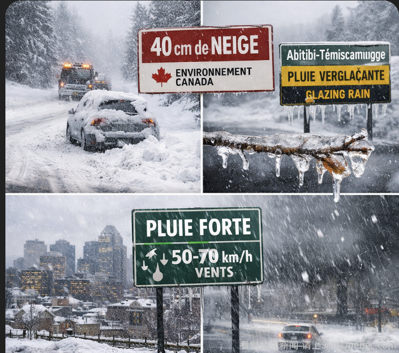 今天周一,魁北克省不同地区预计将出现大雪或降雨天气,同时伴随最高可达90公里/小时的阵风。 在西魁北克,到周二前降雪量预计可达40厘米。 加拿大环境部Environment Canada 已发布冬季风暴警告。 该机构表示,降雪总量预计在20至40厘米之间,同时 Abitibi-Témiscamingue 地区到明天周二早晨可能出现5至10毫米的冻雨。 在魁北克南部,从 Outaouais、Estrie 到大蒙特利尔一带,降水将主要以强降雨形式出现。 在蒙特利尔,预计到周二早晨将有10至15毫米降雨,并伴随每小时50至70公里的强风。 在魁北克省中部,最初会有少量降雪,随后转为间歇性强降雨,并存在冻雨风险,尤其是在魁北克市和 Saguenay-Lac-Saint-Jean 地区,当地气温预计达到6°C。 在魁北克东部,例如 Côte-Nord,预计将出现降雪和吹雪,阵风可达50公里/小时,当地也发布了冬季风暴警报。 之后,大多数地区的降雪仍会持续,但强度会减弱。与此同时,气温将骤降约10度,气温重新跌破冰点。 寒冷感会更加明显,因为届时还会出现阵风最高约80公里/小时的强风。