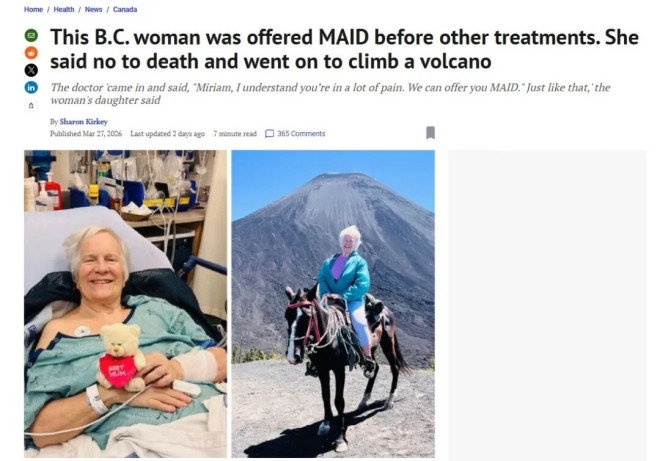 炸锅了!温哥华84岁老人急诊时,医生竟先提“安乐死”? 最近,一起发生在温哥华的医疗事件,引发了不小争议。一名84岁的老人公开讲述自己的亲身经历——她在被送往医院急诊治疗时,医生竟主动向她提出了“医疗协助死亡”(MAID)的选项。这一细节,直接在社交媒体上引发热议。 ![]() 事情发生在Vancouver General Hospital。据报道,这位老人名叫Miriam Lancaster,今年84岁。她在2025年4月因突发剧烈下背痛,被救护车紧急送医,随后被诊断为骶骨骨折——也就是脊柱底部与骨盆连接处的骨折。这类伤通常恢复周期较长,但并非无法治疗。 然而,让她和家人真正震惊的,并不是病情本身,而是接下来发生的事情。她的女儿回忆,当时母亲还处于剧烈疼痛中,一名年轻医生走进急诊室,开口第一句话就是:“我知道你很痛苦,我们可以提供MAID。” 没有铺垫,没有其他治疗方案的说明,就是这么直接。 ![]() 兰卡斯特和女儿都是天主教徒,当场明确拒绝了这一选项。而她们表示,直到拒绝之后,医生才开始提及康复治疗等其他医疗方案。这个顺序,让她们非常不适。 随后,兰卡斯特选择接受正常治疗,并进入医院体系接受护理。她先是在温哥华综合医院住院10天,之后转到UBC医院进行大约三周的康复训练。整体恢复情况很好。 大约六周后,她已经可以正常行走,甚至在女儿的婚礼上陪伴她走上红毯。更让人意外的是,这位84岁的老人恢复后生活非常活跃——她可以自己坐公交、阅读、看剧,甚至在2026年2月,还去了危地马拉旅行,徒步加骑马登上了Pacaya火山。 ![]() 她的女儿直言:“我母亲一点都不虚弱,她还能爬火山。她生活很充实,头脑也很清晰,对我们家庭来说非常重要。” 而兰卡斯特本人也在社交媒体的视频中表示:“当时被提出MAID,完全出乎意料。我只是想知道为什么这么痛,我根本不想死。” 省提名黄金通道开放中!定向机遇稍纵即逝 针对这一事件,Vancouver Coastal Health作出回应。他们表示,由于涉及患者隐私,无法确认具体对话内容,但强调一点: 在具备相关知识和技能的情况下,医护人员可以基于临床判断,考虑是否提及MAID。 ![]() 不过,他们也同时指出:急诊环境通常并不适合主动讨论安乐死这一话题。 这件事,再次把一个敏感问题推上台面:医生,到底应不应该“主动提及”MAID? 按照加拿大现行法律,MAID(医疗协助死亡)是合法的,但有严格条件: 必须由两名医疗专业人员确认 患者需处于严重且不可逆的疾病状态 同时承受无法忍受的痛苦 也就是说,它本质上是一种“在特定情况下的选择”,而不是常规医疗方案。 ![]() 但现实中,围绕MAID的争议一直存在。最近,加拿大部分地区已经开始尝试“收紧边界”。比如阿尔伯塔省正在推动立法,拟禁止医生在患者未主动提出的情况下,主动提及MAID。医学界内部同样存在明显分歧。 有医生和伦理学者认为,如果“结束生命”这个选项和治疗方案被同时甚至优先提出,可能会偏离医学“以治疗和照护为核心”的原则。 回到当事人。兰卡斯特其实并没有否定整个医疗系统。她明确表示,自己在医院的整体护理体验是积极的:“医生和医院在帮助我康复方面做得很好。” 但她依然强调:“在病人处于痛苦和混乱状态时,被提出这种终结生命的选择,是我无法接受的。”同时,她也补充了一点态度——她尊重他人的选择:“MAID在加拿大是合法的,对某些人来说,可能是合适的。” ![]() 这件事在网上迅速发酵,也呈现出明显的两派观点: 支持者认为:医生提供选项,并不等于施压,本质是“信息透明”。 反对者则担心:对老年人、病患等弱势群体来说,这种“主动提及”可能会带来隐性的心理压力。 事实上,这几年加拿大的MAID案例数量一直在增长。随着使用人数增加,关于它的讨论,也越来越从“是否合法”,转向更细节的问题——什么时候可以提?谁来提?怎么提才合适? 像兰卡斯特这样的案例,其实正好踩在这个灰色地带上。当医疗系统面对的是“痛苦的病人”,到底优先提供的是“治疗的希望”,还是“结束的选择”?这个问题,可能才是这次争议背后,真正让人不安的地方。 |