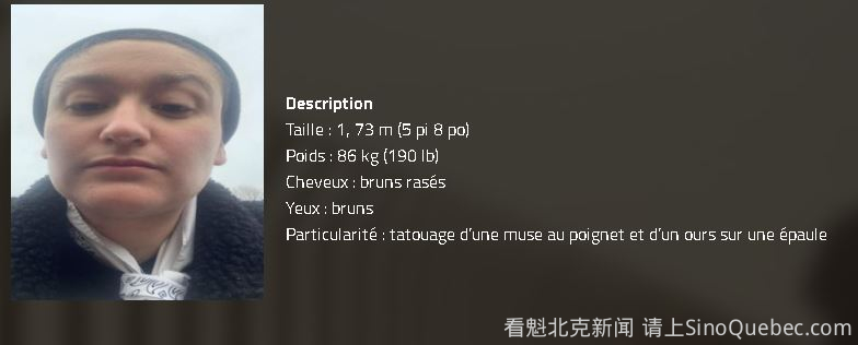 魁北克省警察请求公众协助,寻找一名自周日在Estrie地区Lac-Brome失踪的24岁女子。 失踪者Laurence Lavigne-Cloutier最后一次被看到是在周日下午晚些时候,当时她在Lac-Brome步行出行。警方表示,其家人对她的健康和安全感到担忧。 这名来自蒙特利尔的女子身高1.73米,体重86公斤,棕色剃短发,棕色眼睛。她手腕上有一个“缪斯”纹身,肩膀上有一只熊的纹身。 失踪时,她身穿黑色上衣、黑色针织帽,并穿着深色跑鞋。 如有任何线索,请拨打911,或致电1-800-659-4264与魁北克省警察联系(可匿名)。 |