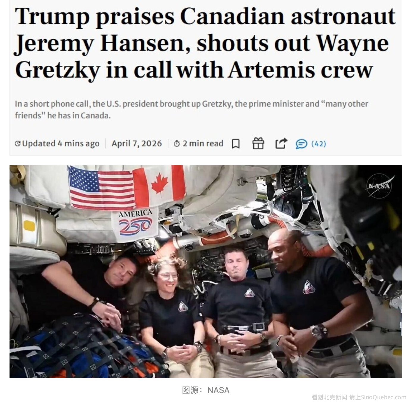 在阿尔忒弥斯二号飞船成功绕月后,美国总统特朗普周一与飞船乘组及加拿大航天员Jeremy Hansen通话并表达祝贺。这次简短通话中,特朗普还点名表扬了传奇冰球选手Wayne Gretzky,并出现了一分钟的尴尬静默。 Hansen在回答了特朗普关于乘组在飞往月球背面的旅途中观察到哪些新景象后,代表加拿大感谢美国在航天领域的领导地位。他说:"我仅代表加拿大向您致谢。" "一个如此引领世界、为人类制定宏伟目标并携手其他国家共进的国家,确实令人敬佩。" 在大约12分钟的通话中,特朗普表示,包括他朋友、前冰球明星Wayne Gretzky在内的加拿大人,都为Hansen的贡献感到自豪。 特朗普说:"我和一位非常特别的人--Wayne Gretzky--你应该认识,就是'伟大的一号'聊过,还和你们的总理以及我在加拿大的许多朋友通话过,他们都为你感到骄傲。" 特朗普并未提及他此前曾提出让加拿大成为美国第51州的想法,而是始终保持祝贺的语气。 "你非常有勇气,"他对Hansen说,"我甚至不确定'伟大的一号'是否愿意做这件事。" 在祝贺之后,通话出现了约一分钟的尴尬沉默,特朗普没有说话,宇航员们则在摆弄漂浮着的麦克风,随后有人问是否"还有人在听电话"。 "我还在,是的,"特朗普答道,"我觉得可能线路断了,毕竟距离很远。"NASA控制中心的工作人员在电话背景中传出笑声。 "你是来自加拿大的杰出人才,"特朗普对Hansen说。他还请求乘组成员签名,并表示会安排时间在白宫椭圆形办公室欢迎他们。"加拿大有许多勇敢的人。" 美加贸易战目前已进入第二年,特朗普政府加征的关税仍在影响加拿大企业。 在美加墨贸易协定下,大部分出口仍免征关税,但金属、木材和汽车等行业仍面临高额关税。 此前,加拿大冰球运动员Wayne Gretzky因与特朗普的密切关系及在贸易战期间保持沉默而受到批评。2025年初,特朗普曾在社交媒体发文称Gretzky"理应支持加拿大现状,但加拿大远未达到最佳状态"。 |