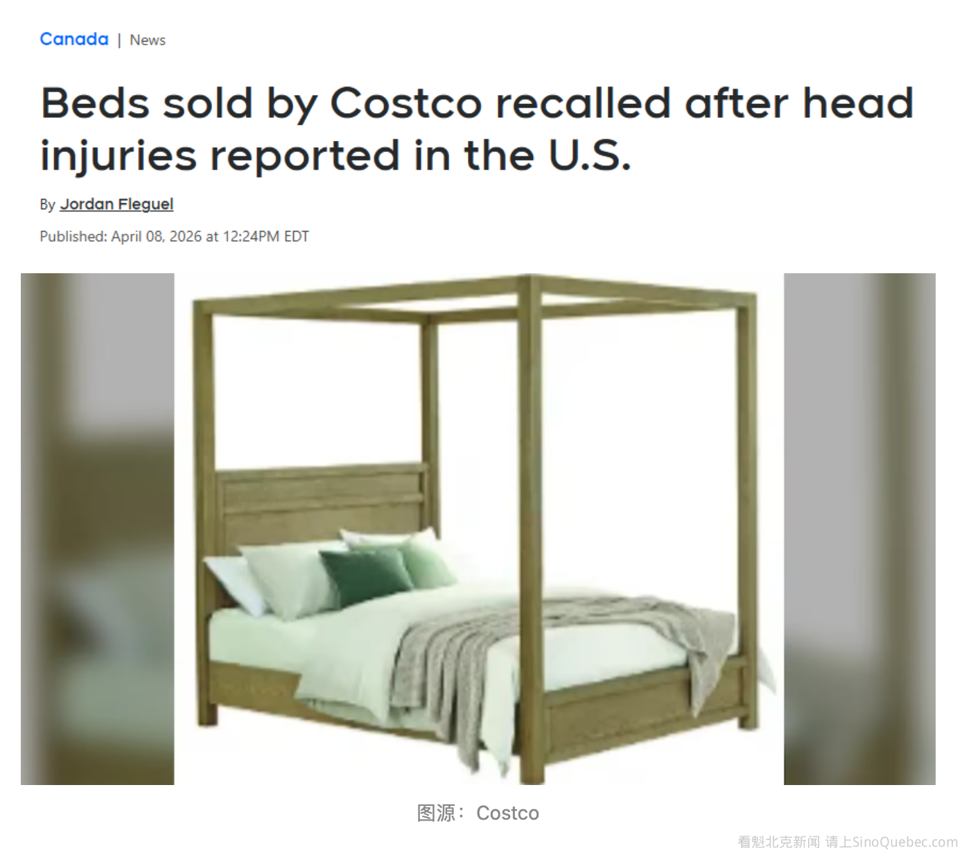 由于美国多起伤人报告,两款在Costco官网销售的天篷床已在加拿大被召回。 Costco周一(4月6日)在其网页上发布了一则“重要召回通知”,称“Oaklynn Canopy”品牌的加大号(King)和标准号(Queen)天篷床正被制造商召回。 通知指出:“出于高度谨慎,Samson International正与加拿大卫生部及美国消费者产品安全委员会合作,自愿召回多款天篷床。”“床架的天篷横梁在移动床体时可能坍塌,对消费者造成冲击和受伤风险。” 通知称,截至3月18日,公司尚未收到任何加拿大地区与这些床相关的伤人报告,但在美国已有五起天篷横梁坍塌的报告。在这些事故中,消费者表示被天篷横梁击中,其中四起导致肩部或头部挫伤。 购买了相关床款的消费者被建议不要移动床架,并立即联系Samson公司,“免费安装四个金属支架及安装硬件进行修复”。 涉及召回的床款(在Costco.ca销售)如下: Oaklynn Canopy Bed,加大号(King),商品编号1812427,型号M24107240 Oaklynn Canopy Bed,标准号(Queen),商品编号181242,型号M24107230 通知中说明:“要确认型号,请查看床架内部右侧(从床脚方向看)制造标签上的‘Samson International’名称及型号。” 如需更多信息,消费者请直接联系制造商。Samson在通知中表示:“对于可能造成的不便,我们深表歉意,并请您将此召回通知转告任何收到Oaklynn Canopy Bed的人。” |