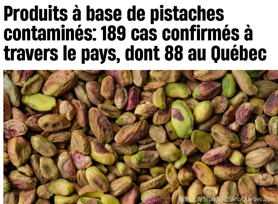 根据加拿大公共卫生局的最新通报,与受污染开心果产品有关的沙门氏菌感染病例已增至全国189例,其中魁北克占88例。 所有病例中有26人住院,但尚无死亡报告。 魁北克病例最多(88例),其次是安大略(74例)、不列颠哥伦比亚(14例)、阿尔伯塔(9例)、曼尼托巴(3例)和新不伦瑞克(1例)。 感染者年龄从1岁到95岁不等,其中女性占70%。 症状出现时间从2025年3月初一直持续到2026年3月中旬。 许多患者表示曾食用开心果或含开心果的产品,包括“迪拜巧克力”、各种糕点(如baklava、knafeh、蛋糕)、坚果混合、冰淇淋以及开心果酱制品(如披萨和三明治)。 检测确认,在被召回的开心果和“迪拜巧克力”样本中发现了致病的沙门氏菌菌株。目前调查仍在继续,以确定是否存在其他污染来源。 近几个月来,公共卫生局已发布多项召回通知,涉及来自伊朗的开心果产品,原因是存在沙门氏菌污染风险。 该机构再次强调:不要食用、提供、使用、销售或分发被召回的产品,也不要用其进行烹饪或烘焙,并建议查看召回清单确认所购产品是否受影响。 感染沙门氏菌后,有些人可能没有症状;如果出现症状,通常在接触后6至72小时内出现,并在4至7天内消失。 可能出现的症状包括:发冷、发烧、恶心、腹泻、呕吐、腹部痉挛以及突发性头痛。