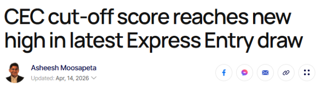 今天(4月14日),加拿大移民部(IRCC)再次通过快速通道(Express Entry,简称EE)系统发出最新一轮移民申请邀请(ITA)。 ![]() 图源:cicnews 本轮共有2,000名加拿大经验类(CEC)候选人获得邀请,是2026年以来名额最少的一次。 更扎心的人,本轮分数线直接飙升至515分,创下今年最高纪录。 要被纳入本次抽选,候选人需满足以下条件: