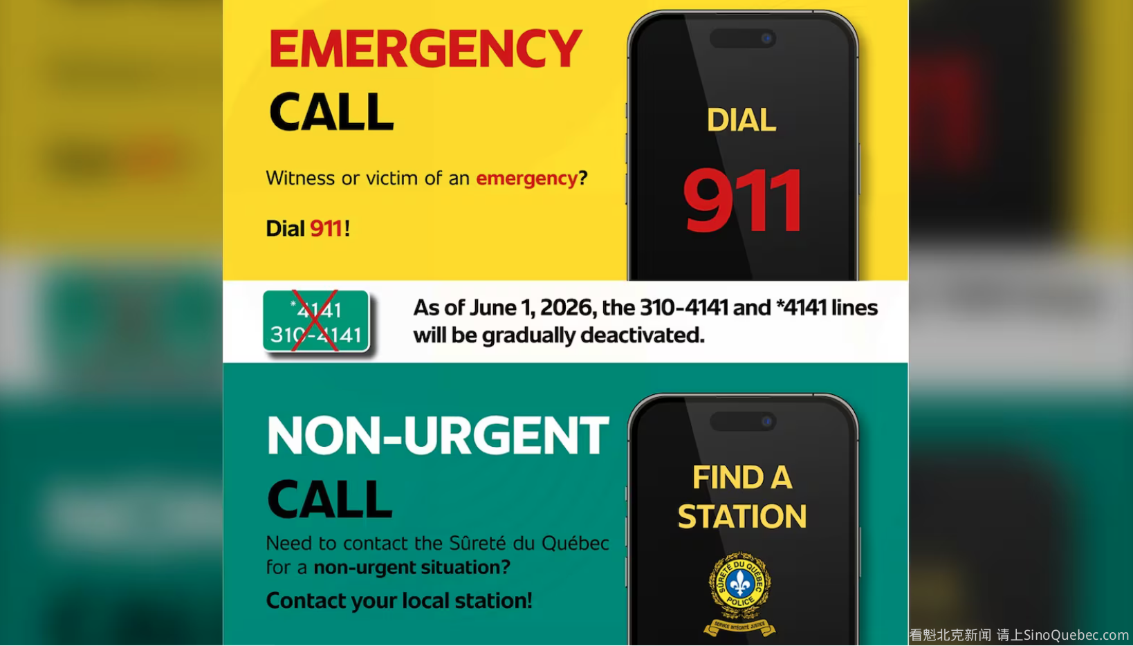 由于正在向数字化 911 系统过渡,魁北克省警察局(SQ)将逐步停用其 310-4141 和 *4141 电话号码。 魁北克省警察局表示,由于电信基础设施的进步,这两个警用电话号码已显得过时,将从 6 月 1 日起开始逐步淘汰。 这些电话线长期以来一直用于非紧急求助,并在某些地区作为 911 的替代方案。在 6 月之后的几个月内,这些线路仍会保持畅通,但拨打后会听到一段自动语音消息,引导拨打者联系相应的服务部门。 今后,居民在遇到非紧急情况时,需直接拨打其所在地区的魁北克省警察局分局电话。分局列表可在其官方网站查询。若遇到紧急情况,仍应拨打 911。此外,路边标有 *4141 号码的指示牌也将被拆除。 魁北克省警察局表示:“这一变化旨在确保电话线路更高效地运作。我们正与所有合作伙伴协作,以尽量减少影响,并确保居民顺畅过渡。” 此次过渡是加拿大全境在 2027 年 3 月 31 日前完成“新一代 911”(NG9-1-1)服务转型计划的一部分。未来,加拿大人将能够向调度中心发送事故现场视频、与救援人员进行实时文本交流,并实现对求救者更精确的定位。 魁北克省政府已投入 4540 万元,用于支持各通讯中心完成这一转型。 |