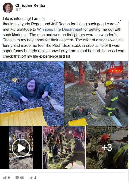 克里斯汀·凯尔巴克(Christine Keilback)在社交媒体上分享了她回家时掉入天坑的情景,虽然她语气颇为乐观,但照片却让人感到震惊。 她写道:“感谢邻居们的关心。 提供零食太有趣了,让我感觉像维尼熊被困在兔子的洞里!”。 ![]() 她说:“这超级搞笑,但我意识到我有多幸运没有受伤”。 ![]() (来源:Christine Keilback / Facebook) 她分享的照片中,她的腋窝下靠一把扫帚和一把雪铲的杆支撑着。如果没有它们的支撑,她也许会完全陷落下去。 CBC今天报道了克里斯汀·凯尔巴克的经历,据称事情发生在上周六晚上,凯尔巴克的朋友琳达(Lynda)和杰夫·里根(Jeff Regan)大约在晚上 9 点左右开车到她位于温尼伯沃尔瑟姆社区利普顿街的家,把她放下。 凯尔巴克从乘客一侧下了车,走了几步,然后她的朋友说看不到凯尔巴克了。他们认为她绊倒了。 凯尔巴克说:“当他们过来时,发现我的头和肩膀刚刚高于地面,这让我很吃惊。地面突然塌陷得非常快。我不记得自己是怎么摔下去的,事情发生得太快了”。 杰夫立刻跑去找东西以便给凯尔巴克提供支撑,他找到了一把扫帚和一把雪铲。 凯尔巴克试图爬上来,但每一个立足点都立刻崩塌了。 之后他们不得不拨打911,温尼伯消防急救服务中心的救援人员在 10 分钟内到达。 消防人员经过和凯尔巴克商量,最后决定安装一个框架和绞车来提升她。 凯尔巴克被穿上了马甲,并被指导如何穿戴。 从她掉进洞里到重新回到坚实的地面,大约花了 40 分钟的时间。 非常让人后怕的是,土壤中突出了一块锋利的金属。如果她掉落到底,后果不堪设想。 温尼伯一位市政府发言人表示,这似乎是一个缺少井盖的集水坑,“但调查仍在进行中”。 该发言人表示:“该地区已被封锁,并将尽快完成永久性修复”。 一位市发言人后来表示,工作人员还检查了道路对面,那里应该有一个第二集水坑,"并发现了类似的情况"。 他们正在确保两个区域的安全,直到修复工作完成。 |