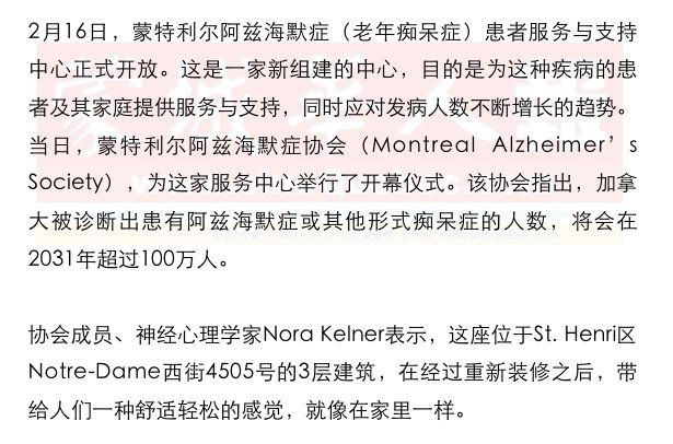 在这家新开放的服务中心Centre de service Alzheimer里,设有会诊办公室以及一间可以进行各类活动的房间,比如说艺术治疗。蒙特利尔阿兹海默症协会的项目与服务主管April Hayward解释说,中心有计划在今后开设更多的这样的房间。 Hayward表示,协会从阿兹海默症患者的看护人员那里了解到的最多的讯息是,不但他们自己需要得到更多的休息时间,而且他们的看护对象也需要进行更多的活动,正是在这样的背景之下,这个永久性的休整与活动中心才得以成立。 Kelner指出,这家中心对很多人来说,将会成为他们摆脱困境的唯一出路,尤其是对蒙特利尔那些多文化社区中的家庭来说,更是如此。在这些家庭中,阿兹海默症常常会被视作是老人年老之后的一种正常表现,并不被视作是一种疾病。 协会网站:http://www.alzheimer.ca/fr/montreal |