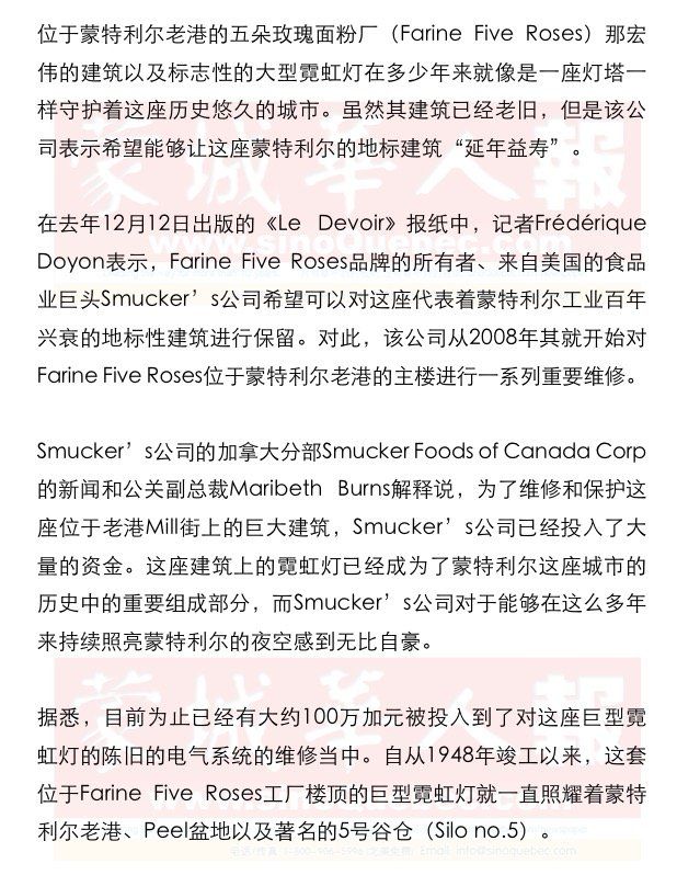 虽然在超过半个世纪的时间里连续照耀着蒙特利尔的夜空,Farine Five Roses的主建筑及其霓虹灯是在2006年才正式赢得了“蒙特利尔历史象征”这个称号的。当时这栋建筑的所有者Archer Daniels Midlands公司刚刚将Farine Five Roses这个品牌的所有权出售给Smucker’s公司,而楼顶的霓虹灯在交易完成之后的2周内都没有再被点亮。 蒙特利尔遗产组织(Héritage Montréal)在发现了这个情况之后,鼓动蒙特利尔居民们呼吁Smucker’s公司再次点亮这传奇的霓虹灯,他们的行动最终取得了成功。 Concordia大学教授Matt Soar在2010年接受媒体采访时表示,Farine Five Roses楼顶的霓虹灯见证了蒙特利尔的历史变迁,是城市的重要标志。Matt Soar曾经一手创建了farinefiveroses.ca网站,用于宣传Farine Five Roses的建筑以及霓虹灯的历史意义,以及失去这座地标建筑对于蒙特利尔这座城市来说意味着怎样的损失。Matt Soar表示,对于一座地标建筑和一个标志到底有多么重要,人们很难下定论。遗憾的是,往往要等到这个重要标志消失以后,大家才会想起它在自己的生活中扮演了什么样的角色。 虽然有不少人宁愿认为Farine Five Roses的巨大霓虹灯为蒙特利尔老城带来的严重的光污染,但是在媒体调查中,数十位蒙特利尔名人都将Farine Five Roses的霓虹灯列为蒙特利尔重要的地标之一。 |
