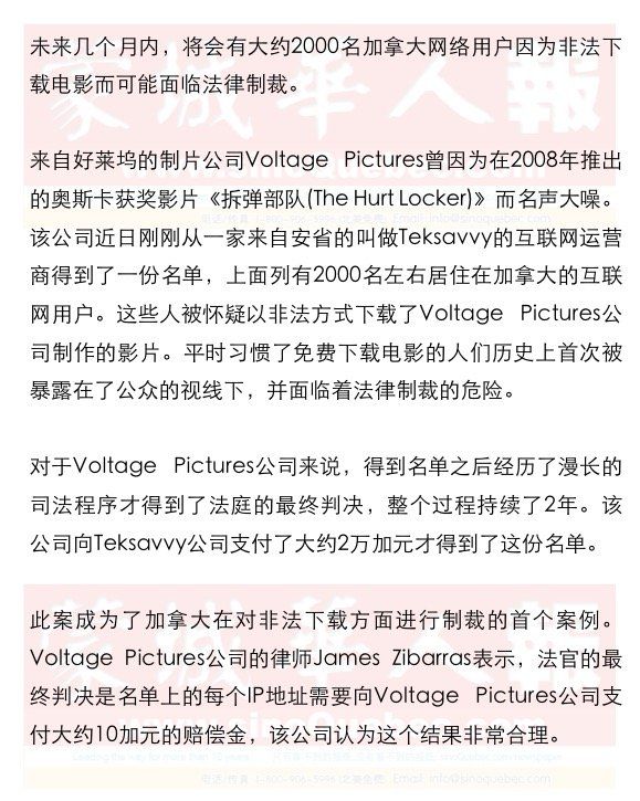 James Zibarras解释说,赔偿金虽然看起来并不多,但这个案件最重要的意义是向那些在网上非法下载电影的人们发送了一个信号。这些人会明白,非法下载就是偷窃,是不会被容忍的。此外,非法下载有可能会导致自己身份被揭露并且被公开,而版权遭到侵犯的一方则有权利采取法律措施维护自己的权益,并获得一笔合理的赔偿金。 这2000人实际上只是加拿大非法下载行为的冰山一角。拥有奥斯卡奖最佳影片《拆弹部队》的Voltage Pictures公司在2年前获得的这份名单上的2000人,实际上只是在2012年的2个月内非法下载该公司电影的人数。 这些遭到处罚的网络用户全部都是一家来自安省的叫做Teksavvy的小型网络运营商的客户。该公司并没有把这些用户的身份公之于众。Voltage Pictures当时选择将Teksavvy公司告上了法庭,并试图迫使后者公布这些非法下载者的身份,否则该公司将无法锁定那些非法下载其电影的网络用户并索取赔偿。最终法官判决Voltage Pictures公司胜诉,但是该公司必须向Teksavvy支付由搜索用户IP并制作名单而产生的全部行政费用。3月17日,Teksavvy公司宣布整个过程耗资21557加元。 整个案件中的5个重要时间点 ◆2012年12月:电影制作公司Voltage Pictures起诉加拿大互联网运营商Teksavvy公司,试图迫使后者向其透露非法下载其电影的2000名网络用户的身份。而作为被告的Teksavvy 则认为,该公司有义务保护自己客户的隐私。 ◆2013年:在法庭上,Voltage Pictures 公司证明了该公司怀疑Teksavvy公司的客户非法下载自己的电影是有根据的。该公司有充分理由相信Teksavvy公司公司的2000名用户通过非法途径下载了自己所拥有的电影。 ◆2014年2月:法官做出判决。Teksavvy公司必须向Voltage Pictures公司透露该案涉及的2000名网络用户的身份。另一方面,Voltage Pictures则必须向Teksavvy支付搜索信息以及制作名单的过程中所产生的费用(行政费用及人事费用等)。 ◆2014年12月:控辩双方无法就制作名单的费用达成一致,并被迫重新回到了法庭。Teksavvy公司在法庭上宣称,该公司在制作这份包含2000名用户的名单的整个过程中花费了大约35万加元。另一方面,Voltage Pictures 公司则坚信,这样一份名单的制作成本不可能超过884加元。 ◆2015年3月17日:法官做出了判决。Voltage Pictures公司需要向Teksavvy支付21557加元才能得到这份包含有2000名网络用户的身份的名单。 |