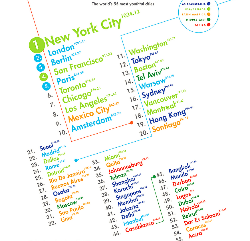 近日2015年“世界最具活力城市榜”出炉,美国纽约拿下冠军、多伦多排名第6,温哥华则排名第17,蒙特利尔紧随温哥华之后位列第18。 据悉,该榜分析了世界55个城市为年轻人提供的服务以及对15至19岁年轻人的吸引力。参考指标包括可负担性、就业、健康、交通等101项,总分1600分。榜首纽约获得1024.12分,蒙特利尔以791.42排名第18位。 榜单前20名中北美城市有9个,欧洲有5个,亚洲3个,拉丁美洲2个,其中墨西哥排在第9位,得分860.42。亚洲方面东京排名12,香港排名19,首尔排名21,上海排名37,新加坡排名39。