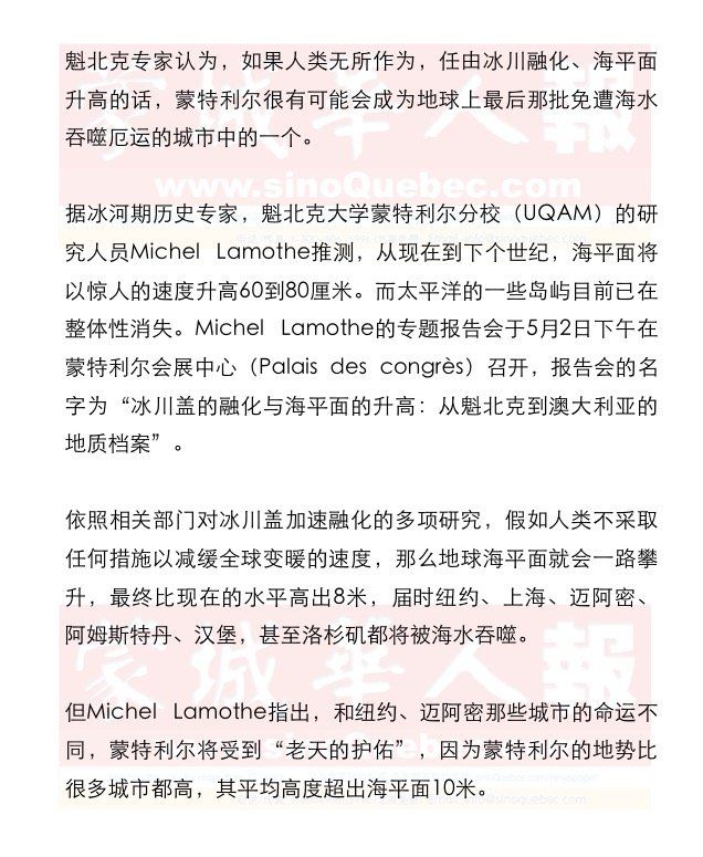 另外,在圣劳伦斯河流域,地壳正以每年几毫米的速度上升,这正好抵消了海平面的升高。而圣劳伦斯河流域地壳的上升,是覆盖该地区1万8千多年的冰川消失的结果,因为地壳之前一直在冰川巨大的重力作用下沉陷,冰川的消融使得地壳能够舒展筋骨,重新“抬头做人”。 地球并不是第一次经历大型的冰川融化,但这次的情况跟往常不同,全球气候高速变暖导致冰川的融化速度加剧,让地球一时难以适应。 Michel Lamothe强调,冰川的加速融化会给人类生存和经济发展造成灾难性后果,尽管全球气候变暖的部分作用是不可逆转的,但人类可以通过减少温室气体的排放来减缓全球气候变暖的进程,进一步避免世界各大城市被海水吞噬的厄运。 海平面升高及相关数据一览 从1993年至今,海平面平均每年升高3.2毫米。 从现在起至2100年,预计海平面总共会升高1.8米。 全球约有1亿5千万人生活在高出海平面1米的位置,而6亿人所处的地方超出海平面不到10米。 近20年来的科学观测显示,格陵兰岛的冰川融化是导致地球海平面升高的最主要因素之一。 |