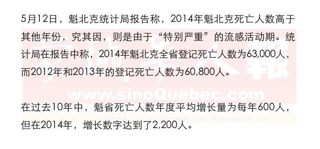 报告指出,2014-2015年度的流感活动期开始得比常年要早,2014年的死亡人数也高出常年。统计局预计,到明年统计2015年死亡人数的时候,1月份的情况可能会与2014年12月相似。在报告中,Fleury-Payeur还指出了死亡与季节之间的某种关联,即年轻人在夏季因道路交通事故或溺水事故而死亡的情况发生得更加频繁,而老年人的死亡多发生在冬季。 根据统计局的这份报告,2014年魁北克人男性的平均寿命为80.2岁,女性为84.1岁。多年以来,魁北克人的平均寿命在加拿大各省份中一直是最低的,但现在则位居第三,排在卑诗省和安大略省的后面。 |
