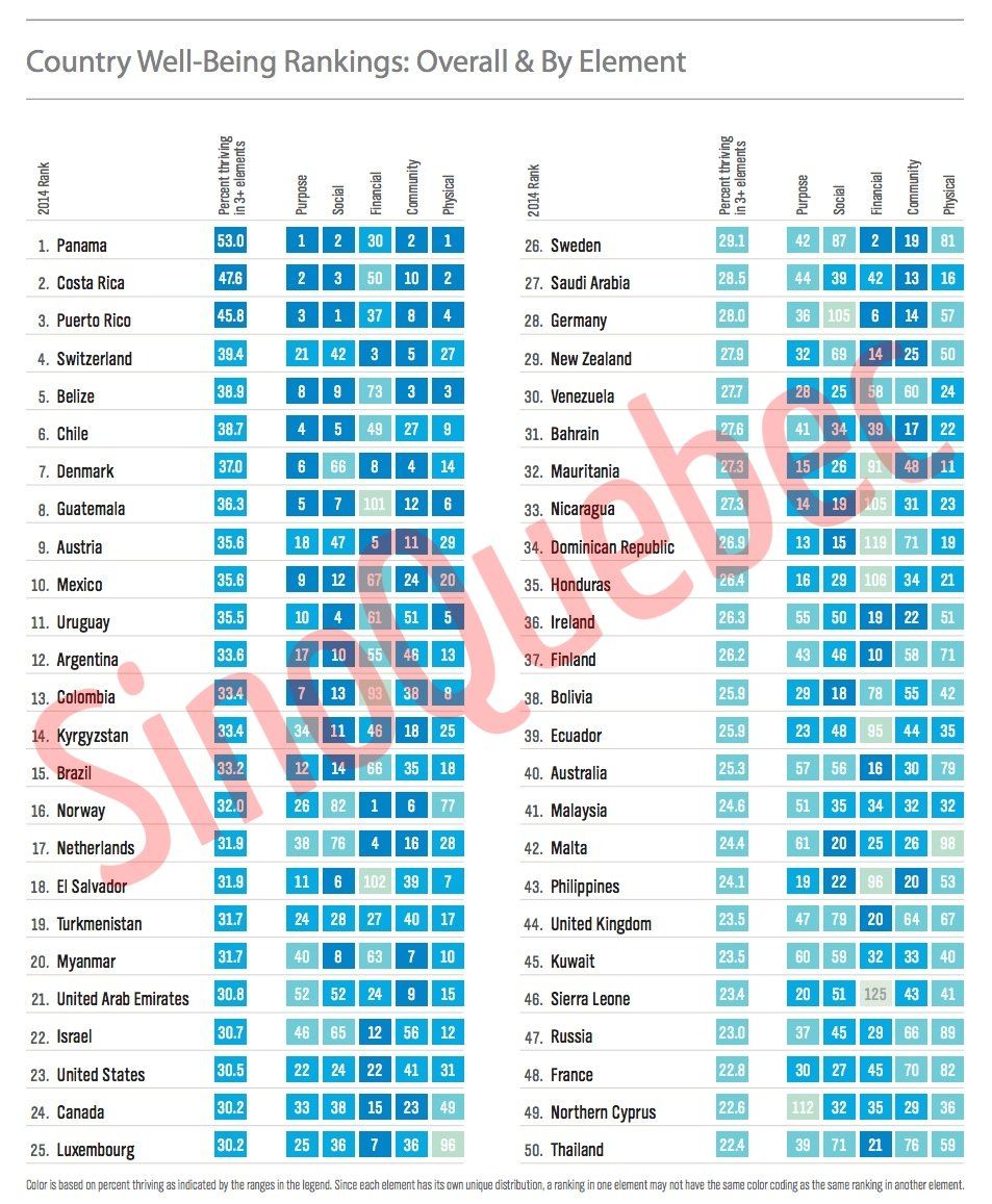 盖洛普(Gallup)与Healthways健康机构昨天(24日)公布2014年度全球幸福指数报告。调查结果显示,中美洲国家巴拿马连续第2年位居榜首,阿富汗为最不幸福,排名垫底。加拿大排名第24位,美国这次排名第23名,中国列第127位。 该幸福指数针对全球145个国家及地区的居民就5大领域的幸福程度进行评分,调查访问逾14.6万人。5大领域包括生活目标、社交生活、财务状况、社区归属感及身体健康。这次调查新增11个国家或地区。 在幸福指数十大排行榜中,拉丁美洲占了7席,而欧洲则在金融方面占优。前十名排行依次是巴拿马(53.0%) 、哥斯达黎加(47.6%) 、波多黎各(45.8%) 、瑞士(39.4%) 、伯利兹(38.9%) 、智利(38.7%) 、丹麦(37.0%) 、危地马拉(36.3%) 、奥地利(35.6%) 和墨西哥(35.6%) 。美国这次排名第23名,去年的排名为第12名。 报告称,巴拿马连续第二年问鼎该指数,53%的居民在3个或更多领域感到幸福,这些范畴包括个人目标、财务和身体健康。 人口仅有400万的巴拿马却是中美洲区内发展最快的第一大经济体,也是人均消费水平最高的国家。去年一份报告将巴拿马列为退休生活指数排名榜榜首,是北美退休人士首选的生活之地。 调查还发现,全球平均每6名成年人中,只有1人在3个以上领域感到幸福。 亚洲国家排名最高的并非传统发达国家,而是排名14 的吉尔吉斯,土库曼排名19。在两岸三地中排最高的是台湾居59位,新加坡排名97,香港排名120,中国则排名127。 香港这次排在下游的120位,仅有8.6%的受访者感到幸福,在5大领域中香港人仅在“财务状况”表现较好,其余4项均得分甚低。香港人在“生活目标”及“身体健康”两个分项,更是排在倒数第6。 阿富汗(0.0%) 在2014年总体幸福指数中排名垫底,没有居民被认为在任何领域感到幸福。