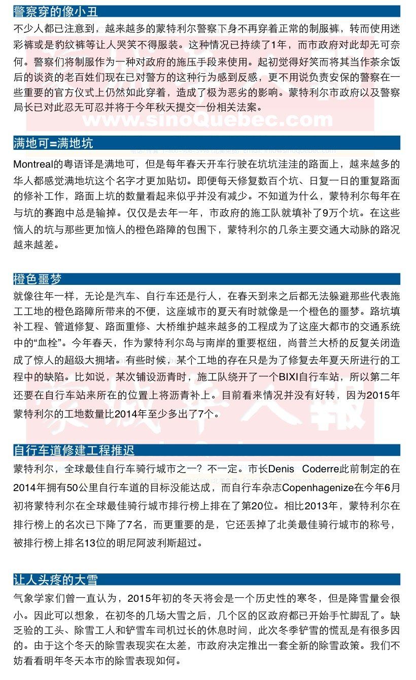不断转变和发展中的蒙特利尔自诩是一个多元文化的城市。除此之外,繁荣的经济和繁多的大型国际活动也让其贴上了国际大都市的标签。那么,对于这里的居民们来说,如今在蒙特利尔的生活是正在改善还是越来越糟呢? 以下是今年夏天蒙特利尔人迎来的五个好消息和五个坏消息。 五个好消息 |