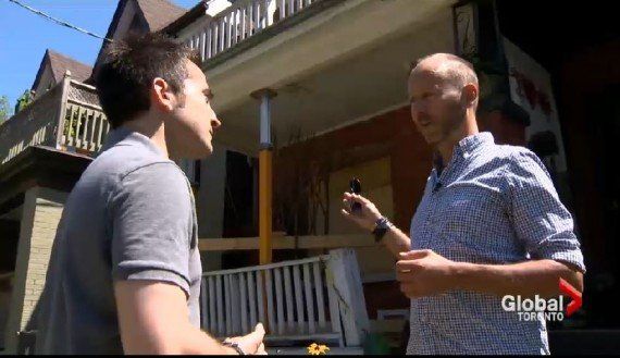 如果你碰巧买了个半独立屋,而与你一墙之隔的邻居对他的房子不管不问,导致房子快要坍塌了,你会怎么办?居住在多伦多439号Pacific Ave.的Jack Krasowski就是这样一个倒霉蛋,他碰到了一个百万富翁却有家不住四处流浪的邻居。 据CBC报道,Jack Krasowski的房屋与一座1500呎的半独立屋441号只有一墙之隔。Jack Krasowski说,这个房子已经有上百年的历史,需要经常维修,但该屋主人从来不去做。由于这房子每下愈况,问题愈来愈多。邻居们为此投诉了好几年,希望这个碍眼的房子不要影响整个社区的房产价值。 Jack Krasowski(右)接受记者采访 让Jack Krasowski不理解的是,他的邻居是一名的独身男子,是个百万富翁,却有屋不住,流落到街上当流浪汉。他曾经见到屋主拿着一个垃圾袋,在大街捡空啤酒罐,准备拿去换点小钱买烈酒。Jack Krasowski问他是否会维修房子,这个男子回答说他不会修的。 这个房子至今已经空置了8年,房子外面贴满了政府催缴地税的通知,但是没人理睬。曾有流浪汉试图栖身于此,随后被警方驱逐。屋顶因年久失修而崩塌,房屋成了浣熊等动物的乐园,院内杂草有一人。阳台有坍塌的趋势,市府不得已用液压支撑柱将阳台撑起。 GOOGLE地图显示,左侧的屋顶破烂不堪 因为两家共用排水管,邻居的屋顶坍塌把排水管扯烂。一下大雨,雨水就从排水管下来,顺着扯烂的破洞涌进Jack Krasowski的房子,把他的屋顶也破坏了。 Jack Krasowski为此事找市政府多次,但一直没有解决问题,最后他找到市议员,他希望能尽快解决这个问题。