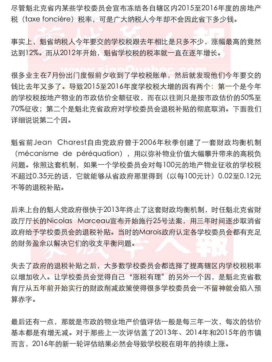 魁省学校税上涨的几个实例 蒙特利尔岛内共有5个法语和英语的学校委员会,蒙特利尔学校委员会(la Commission scolaire de Montréal)是其中重要的一员。由于物业价值的攀升,蒙特利尔整个岛内的学校税平均涨幅为3.7%。 蒙特利尔南岸的Marie-Victorin学校委员会2015至2016年度的学校税税率为每100元0.002234元,跟2014至2015年度相比有轻度上涨,平均涨幅为8.5%,这要归因于当地物业地产估价的上升。 CS des Grandes Seigneuries是蒙特利尔南岸的另一个学校委员会,它在2015至2016年度的学校税税率为每100元0.0029735元,比2014至2015年度稍高,平均涨幅为4%。 Portages-de-l’Outaouais学校委员会将2015至2016年度的学校税税率定为每100元0.0025269元,比2014至2015年度的0.0024898元高一点点。 就目前来说,学校税涨幅最高的可能是Basses-Laurentides地区的la Seigneurie des Mille-Iles学校委员会,其辖区内的一些居民今年要交的学校税跟2012年相比,竟然高出了52%。以市政估价为22.7万元的一栋物业为例,其业主为之缴纳的学校税在过去的三年中,每年相继增长了28.5%、12%和11%,原因就是这栋物业的价值在一路攀升。到2015至2016年度,当地的学校税税率已由之前的每100元0.002123元上涨为0.002712元。 还有一些学校委员会(比如说魁北克城的la Capitale学校委员会和Montérégie地区的Val-des-Cerfs学校委员会)的新税率需要在8月份经过委员投票表决之后方能推出。 学校税的四大基本用途 ◆建筑房屋及设备的维护保养; ◆室内供暖及照明(此项费用在2014至2015年度上涨了2.9%); ◆大约三分之二的校车交通费用(依照有关部门制定的2012至2017五年协议,此项费用根据每年的消费价格指数计算确定); ◆学校及学校委员会的管理费用,其中包括为少年儿童及成年人提供的各项教育服务、人力资源服务、设施及器材资源、财务资源和计算机信息资源。 |