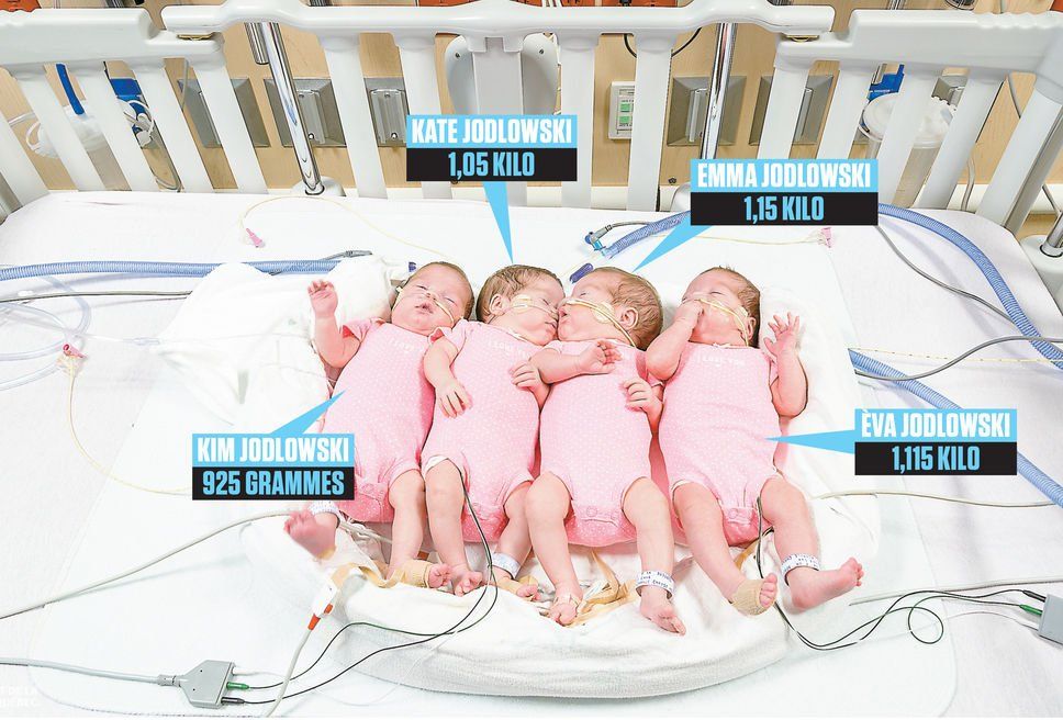 魁北克省内外多胞胎数据一览 2014年,3%的魁省孕妇怀的是双胞胎、三胞胎或多胞胎(这个数据在1989年为1.89 %)。 2014年,魁省全年共有64例三胞胎及多胞胎降生。省内1988年以来的三胞胎及多胞胎最高诞生纪录是2005年的86例。 2000年以来,魁省共有5例四胞胎诞生。 2015年4月,一名已有一个女儿的魁省妇女在美国得克萨斯州生下了五胞胎女儿。医生之前只是在她体内植入了四个胚胎,但是其中一个却自行分裂发育为两个。 2015年5月,一名65岁高龄的德国妇女诞下四胞胎,在此之前她已有了13个子女和7个孙子女。 |