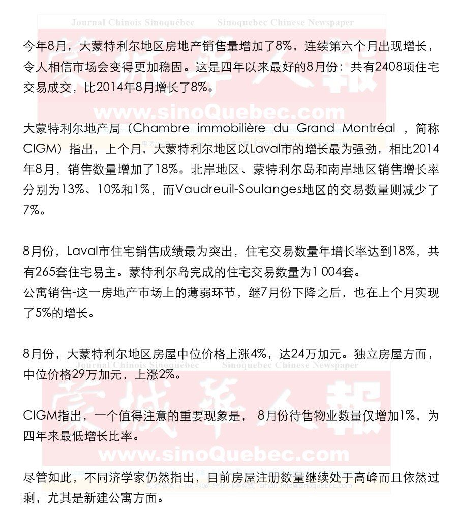 LAVAL市的独立住宅中位价格达到30万加元,这意味着,Laval市售出的一半独立房屋价格低于30万加元,而另一半则高出这个价格。共管公寓方面,中位价格为21.8万加元。一年前,LAVAL市的独立屋的中位价格曾经是39万加元,共管公寓为28.125万加元,而Plex房型(包含2-5个单元)的中位价格为47万元。 北岸地区在2015年8月共完成530套住宅销售。这一地区也是一年来销售活动大幅增长的地区,销售数量跃升了13%。独立房屋中位价格比Laval市和蒙特利尔略低,为24.5万元;公寓中位价格也是同样的情况(18.275万加元)。 南岸地区8月份住宅销售数量为481套。年增长率只有1%。独立房屋中位价格是:28.5万加元;公寓为20.4万加元。 如果说住宅销售在8月份打破了纪录,而待售房屋的新注册数量则增长微弱:8月份整个地区共注册有1098套待售住宅,相比2014年8月仅增长1%,这是蒙特利尔地区四年来注册数量增长比例最低的月份。 |