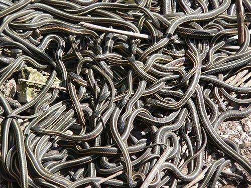 在马尼托巴著名的蛇穴NARCISSE是世界上最密集的蛇穴。每年春季,无数条红花纹蛇就会爬出洞穴进行交配,草丛里,树木上,岩石上都看到一条条纠缠扭动的小蛇。但是这种蛇通常都是无毒的,当地还有人把这种蛇当做宠物,所以你尽可以放心大胆的捡起它们,打个招呼问候一下~ 但是可以捡,可以摸,甚至可以尝试去亲亲,但是,千万千万不要去踩啊!