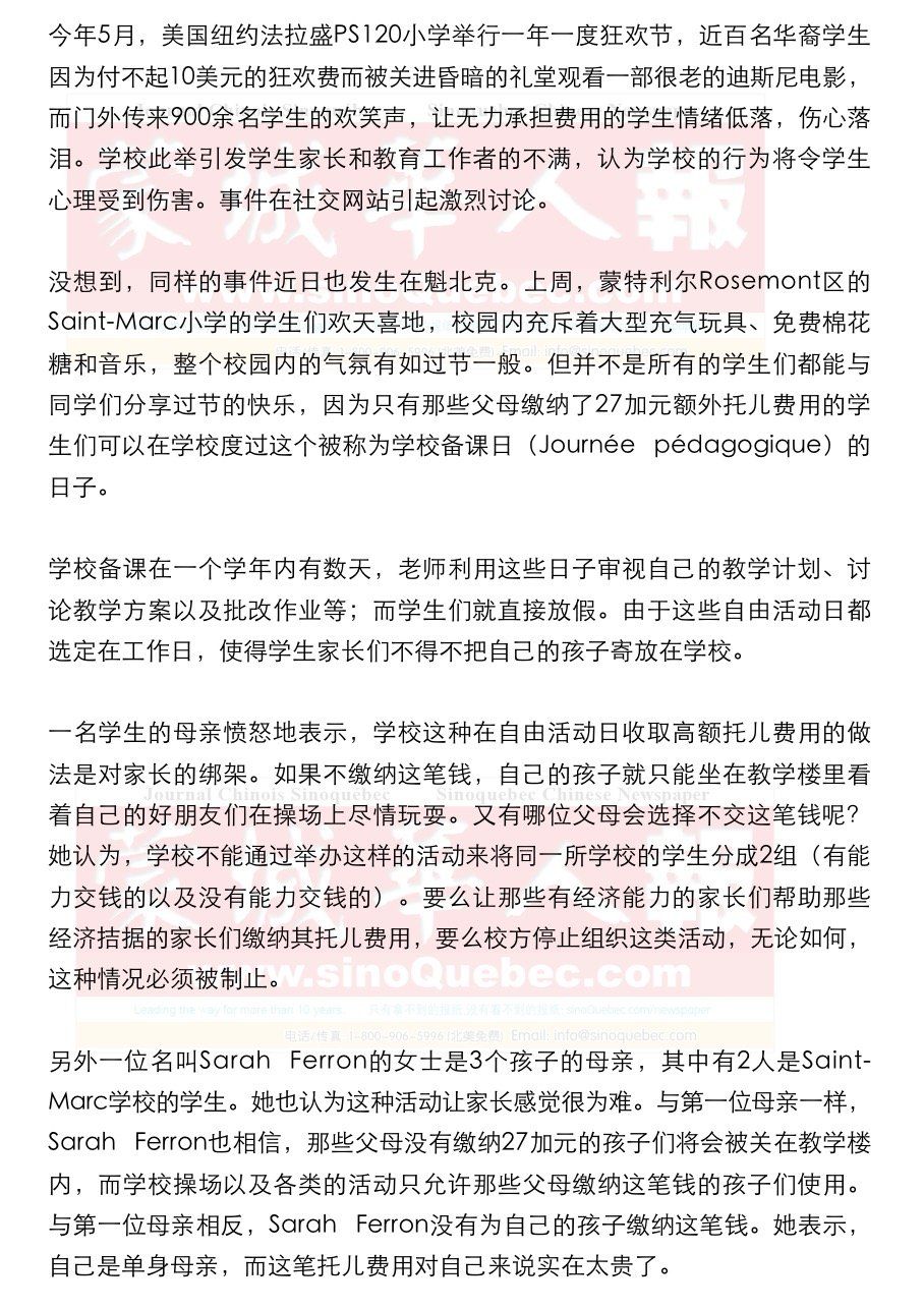 上述情况不仅仅发生在Saint-Marc小学,实际上在上周的整个魁省境内的大小学校内都在上演着相似的清洁。据悉,有的学校在体育馆内建起了一个迷你动物园,有的学校则为学生们建起了一座临时电影院。当然,这些娱乐设施都是提供给那些家长有足够经济实力的学生们的。 对于Saint-Marc小学的问题,蒙特利尔教育委员会(CSDM)主席Catherine Harel-Bourdon表示,学校自由活动日的日程安排是由代表着学生家长的学校用户委员会(Comité d’usagers)以及学校董事会在每年春天共同安排的。 Catherine Harel-Bourdon表示,教育委员会发现围绕着学校自由活动日的抱怨越来越多。她提醒家长们,如果有针对自由活动日的日程安排方面的不满,可以向学校的董事会进行投诉。 Catherine Harel-Bourdon同时承诺,CSDM准备全方面的重新审视其有关学校自由活动日方面的政策。此外,CSDM还开始着手与蒙特利尔各城区的体育中心、户外活动场所以及蒙特利尔交通局(STM)进行协商和谈判,希望在于上述供应商达成集体协议之后可以在一定幅度上减少学生集体活动和外出的成本。她表示,目前来看,她至少可以向学生家长们保证,他们将可以在托儿服务和学生集体外出活动之间做出选择。 魁省教育部授权旗下所有学校就托儿服务向学生父母收取比一般学校组织的外出活动更高的费用。但是,该费用的金额必须合理,而且反映了学校方面组织和提供托儿服务的开支。 魁省教育机构董事会联合会(Fédération québécoise des directions d’établissement d’enseignement)主席Lorraine Normand-Charbonneau则认为,这种对学生们区别对待的活动完全没有存在的理由。她表示,学校需要记住的是,那些在操场上玩耍的孩子和那些被留在教学楼内的孩子同样都是学校的学生,他们没有任何区别,也不应该被区别对待。 Lorraine Normand-Charbonneau表示,当她担任学校校长的时候,无论这所学校所处的社区条件比较富裕还是相对贫穷,她都时刻提醒自己不能对那些家境优越和家庭贫寒的孩子们区别对待,也不能让他们感觉到自己与其他孩子有任何不同。 她还记得有一天,自己所在学校的教师们向她提出了一套全年需要收费200加元的托儿计划,而这所学校当时所处的社区并不富裕。她当时就给予了否决。 至于学生家长方面,Lorraine Normand-Charbonneau相信他们肯定希望自己的孩子在被学校看护期间可以尽可能多的到户外换换空气。与此同时,这些活动不需要被精心设计成另学生们终身难忘的体验,也不需要过高的收费。 魁省家长委员会联盟(Fédération des comités de parents du Québec)主席Corinne Paye对于这样的事情持续发生感到难过。她表示,无论是作为一名母亲还是作为该组织的主席,她都对于这类高收费活动在魁省校园内的普及感到遗憾。在公共教育系统中还存在以钱为标准对孩子们区别对待的现象,这根本说不通。如果她所在的社区内的学校采取同样的做法而她也拿不出钱让自己的孩子参加活动的话,她无法想象自己将如何向自己的孩子解释,为什么其他孩子都在操场上玩耍而自己则被留在教学楼内。 |