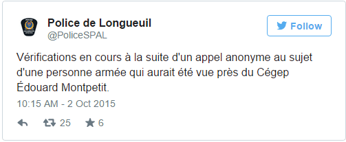 最新消息: Longueuil警方经过一个小时的搜索后表示只是虚惊一场。 警方发言人Melanie Mercille称,经过搜索调查后并未发现枪手和枪声,学生的安全没有受到威胁。 之前本网报道: 有报告称蒙特利尔南岸Longueuil地区有一名持枪男子,该地区两所学校已被警方封锁。 今天早上,CEGEP Edouard Montpetit的一名学生向保安称,看到一名持枪男子在走廊里行走,学校立即联系警方并封锁了该校,学校附近地区已经被疏散,大约有2000名学生仍留在校内。 毗邻该校的高中Jacques Rousseau也被封锁。 目前Longueuil警方正在搜捕持枪男子。 Longueuil警方推特: |