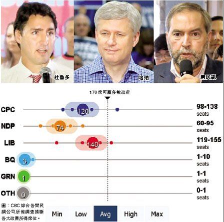 加拿大联邦大选明天举行,全国338个国会议席谁属将交给选民作主!根据加拿大广播公司(CBC)综合各间民调公司所做调查推断,在全国338个国会议席中,自由党可夺得140个议席组成少数政府,而保守党将会获得120席成为最大反对党,新民主党则可获得74席。 今次大选在安省、卑诗省、阿省和魁省都增加了选区,选区数目由原来的308个,增加至338个。 据CBC预测各党明天可以夺得的国会议席,自由党在安省将会取得突破,与2011年比,可以多赢取54席,但距离组织多数政府的170席,仍差30席。 若此推断正确,自由党赢得大选後,在国会内需要通过法案,仍需要其他政党支持,而最有机会与自由党合作的,仍是新民主党。 根据Nanos民调公司昨日公布的最新民调指出,自由党在全国的支持率为37%,排第2的是保守党的30.7%,新民主党则为22.6%。 这项民调於上周三(400人)、上周四(400人)、上周五(800人)进行,透过电话随机访问了合共1600名合资格选民,调查的正负误差率为2.5%。 自由党在太西洋省份、魁省、安省、卑诗省份全部领先,而保守党则在草原省份领先。 另外,据Ekos民调公司发出的最新资料,自由党在安省此重要战场取得最大的优势,保守党能够保住草原省份的支持率。 调查并指出自由党正逐步蚕食保守党的长者选票,另外在大专学生的支持度,自由党亦明显占优。 哈珀今年8月2日宣布大选前,国会308个议席中保守党有167席、新民主党102席、自由党34席、魁人政团4席和绿党1席。 逾2000万选民明投票 决定国会山庄变色否 这届联邦大选共有27名华裔候选人,当中在安省有11人,卑诗省有12人、魁省有4人,与上届22人参选相比,多出4人。 在上届大选自由党在大多伦多地区一败涂地,把保守党推向多数政府地位,但在今届大选,若是一如民调所料,情况可能逆转,自由党会收复失地把区内多个选区由蓝变红。 国会山庄在明天大选後会否风云变色,得视乎全国超过2400万名选民的投票意向。 在2011年的大选中,全加拿大共有24,257,000选民,投票率为61.1%。 另外,明天(19日)是加拿大第42届联邦大选的投票日,所有合格的选民都应该去投票,履行公民权利,选出能代表自己的候选人进入国会。 凡是合资格的选民,应该已经收到邮寄的选民资料卡(voter information card)。这张资料卡确认你的姓名已经列入选民名册(voter's list),同时通知投票日期、地点和时间。 安省东岸时区的投票站的开放时间,是早上9时30分至晚上9时30分,必须拿着选民资料卡到指定的投票站投票。 投票前,选民必须出示身分与住址证明,网上张贴有可接受的身分证件清单。这份清单可查阅网站elections.ca,亦可致电加拿大选举事务署,电话1-800-463-6868。 选民资料卡不算一项认可的身分证明,但官员鼓励选民携带这张卡,以加快投票站的程序。 即使没有收到选民资料卡,亦可以致电上述电话,职员会告知阁下是否登记成选民。 如果持有适当的身分证明文件,也可以在投票站现场登记投票。