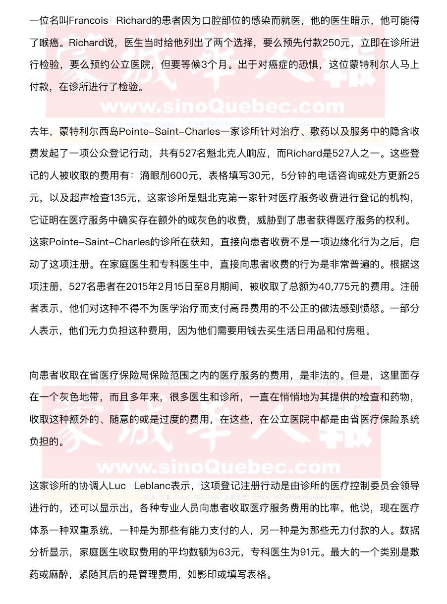 上周,魁北克卫生厅厅长Gaétan Barrette提交的《20号法案》获得省议会通过。在这套法案中,包含了对可以在诊所中收取的、在保险范围之内的服务的合法费用的修正案,这些通常被称作是“附加费用”。稍后,政府会推出在其管控之下的辅助费用清单,不过在此之前,政府要聘用一家独立的会计事务所,来测定实际成本。Leblanc指出,事先没有进行公共咨询,是因为最初的《20号法案》中没有提到这种可能的附加费用。他还补充说,政府事先也没有进行研究或调查,来确定附加费用的范围或对当前费用的影响。 包括加拿大医学会、魁北克医疗协会、加拿大医疗保险医生组织以及魁北克医疗保险医生组织(Médecins québécois pour le régime publique,MQRP)在内的批评人士表示,引入直接向患者收取费用的做法,是对全民医疗保险体制的一种严重威胁。10月份的时候,这些人士曾要求Barrette暂缓对费用进行调整。 医疗保险促进组织---魁北克医疗保险医生组织的主席Isabelle Leblanc表示,医生办公室或诊所因为在医学上必须的治疗服务而向患者收取费用,是令人无法接受的。她补充说,这种做法是对全民医疗核心原则的一个严重打击,因为获得医疗保健是应当基于患者的需要,而不是其支付能力。 Pointe-Saint-Charles诊所医疗委员会的Louis Blouin表示,委员会正在要求Barrette停止额外费用,并且呼吁新上台的联邦卫生部长Jane Philpott立即采取行动,强制魁北克遵守《加拿大医疗卫生法》。目前,该委员会仍在继续对医疗服务隐含费用进行在线登记,登记网站为https://twitter.com/HealthIssues。 |