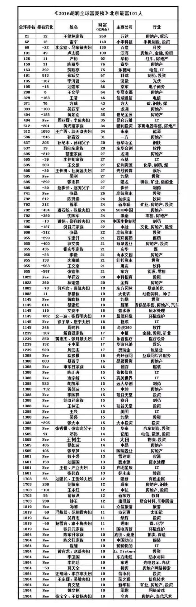 北京首次超越纽约成了全球“富豪之都”。 在约有2152万人口的北京,居住着101位超十亿美金富豪。 这101位富豪富可敌国,他们的财富总额总计2830亿美金。超过了爱尔兰、葡萄牙这些欧洲国家的GDP。 赵薇首次上榜,74岁陈丽华成女首富 在北京“十亿美金富豪榜”中,以家族身份出现者有13位,包括著名的王健林家族,以及还在狱中的黄光裕的家族。其中,王健林家族以260亿美金成为北京最有钱的人。同时,他也首次超越李嘉诚成为华人首富。 黄有龙、赵薇夫妇 以夫妇身份出现者有18位,包括潘石屹、张欣夫妇,以及新入榜的黄有龙、赵薇夫妇。作为影视明星,近几年来,赵薇在资本市场上屡有斩获,有“中国的女巴菲特”之称。 而以单独的女性身份出现在榜单中的,仅有三位,分别是74岁的陈丽华、51岁的吴亚军、58岁的肖文慧。她们均有从事房地产行业的背景。其中,陈丽华是该榜单中年龄最大者,74岁。作为富华国际集团主席,她以76亿美金在全球富豪榜中排名159位,比上次榜单上升了31位。 陈丽华最广为人知的身份是《西游记》唐僧扮演者迟重瑞的妻子。据公开报道,《西游记》播出后,出身京剧世家的迟重瑞遇到了酷爱京剧的陈丽华,很快迸出了爱情的火花,1990年迟重瑞与陈丽华登记结婚。当时,陈丽华已拥有上亿元资产,比迟重瑞大11岁。 最小富豪32岁 在北京最有钱的101名富豪中,50至60岁年龄段占据了多数,共有43位。俞敏洪,王中军以及潘石屹夫妇都在此序列。40至50岁年龄段,有35位10亿美金富豪。60至70岁年龄段有13位。30至40岁年龄段的富豪有8位。 目前还未出现30岁以下的十亿美元富豪。 70岁以上仅有3位,除陈丽华外,还有赵步长和刘淑芹,他们二人均与制药行业有关。 在该榜单上,年纪最小的是32岁的“滴滴”创始人程维。 滴滴从80万人民币的启动资金发展到目前超过1000亿元的估值。在公司发展的同时,程维个人财富也在增加。在本次全球富豪榜中,他以10亿美金位居1964位。 谁的财富缩水了? 101位富豪集中于房地产、投资和IT行业。涉足房地产行业的富豪27位,投资行业28位,IT行业则集中了9位。 这与全球富豪榜的行业排列大体相同。 此次新上榜富豪共34个,与榜单上出现的富豪可以看到明显的区别:过去已上榜过的富豪多从事房地产行业,而在新上榜富豪中,他们集中于IT和投资领域。 在房地产行业中,有诗人之称的房地产商黄怒波财富缩水最多,缩水了35%,以15亿美金在此次全球富豪榜中排名1388位,名次下降了732位。 而备受关注的潘石屹和张欣夫妇,财富缩水23%,紧跟其后。 在科技行业中,李彦宏、马东敏夫妇财富缩水28%,以130亿美金在全球富豪榜中排名69位,名次下降了22位。 虽然京东和京东金融尚在巨亏期,但刘强东再度上榜,受科技股下跌影响,财富缩水1%,在全球富豪榜中排名195,名次下降了18位。 |
