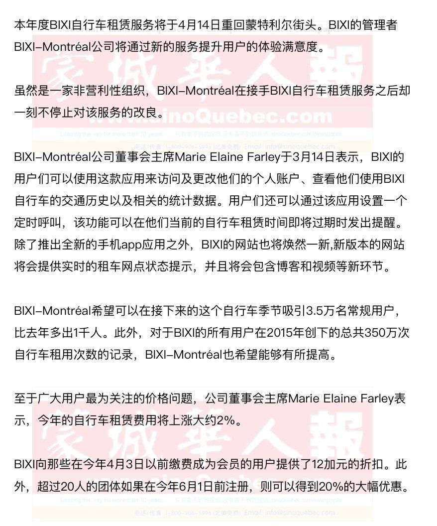 在6月份,BIXI-Montréal将会公布公司去年的财政状况。公司董事会主席Marie Elaine Farley表示,她对于达到预定财政目标很有信心,她甚至相信公司会超过此前制定的目标。虽然乐观,Marie Elaine Farley的整体态度还是十分谨慎,因为为了避免BIXI的前任管理者因经营不善导致破产的结局,今年BIXI-Montréal的财政报告将会被一家会计师事务所核实之后才能公开。 在BIXI的前任管理者“自助式自行车租赁公司”(SVLS)在2014年宣布破产之后,蒙特利尔市政府接受BIXI并成立了非营利性的BIXI-Montréal公司。目前,BIXI自行车租赁服务系统拥有5200辆自行车,并在蒙特利尔、Longueuil和Westmount总共拥有460个租车网点。蒙特利尔市政府是该服务的主要注资者之一,截止至2018年将总共为BIXI投资290万加元。 目前为止,BIXI-Montréal还没有扩大BIXI服务面积的想法。 |