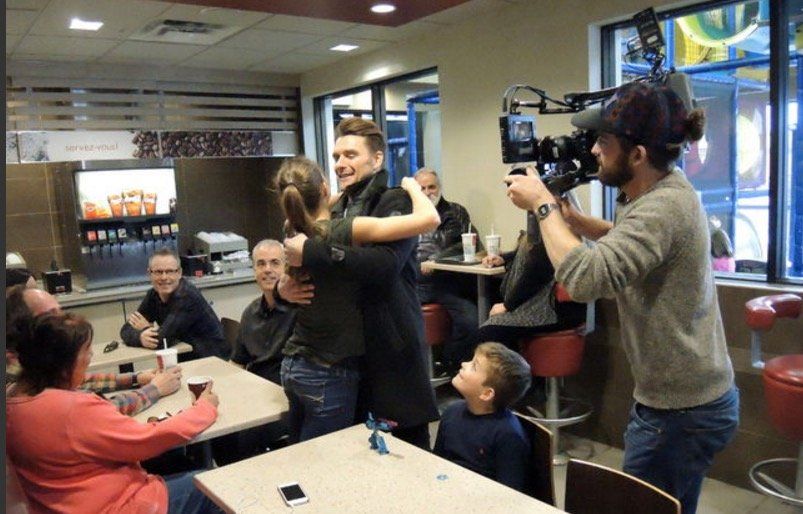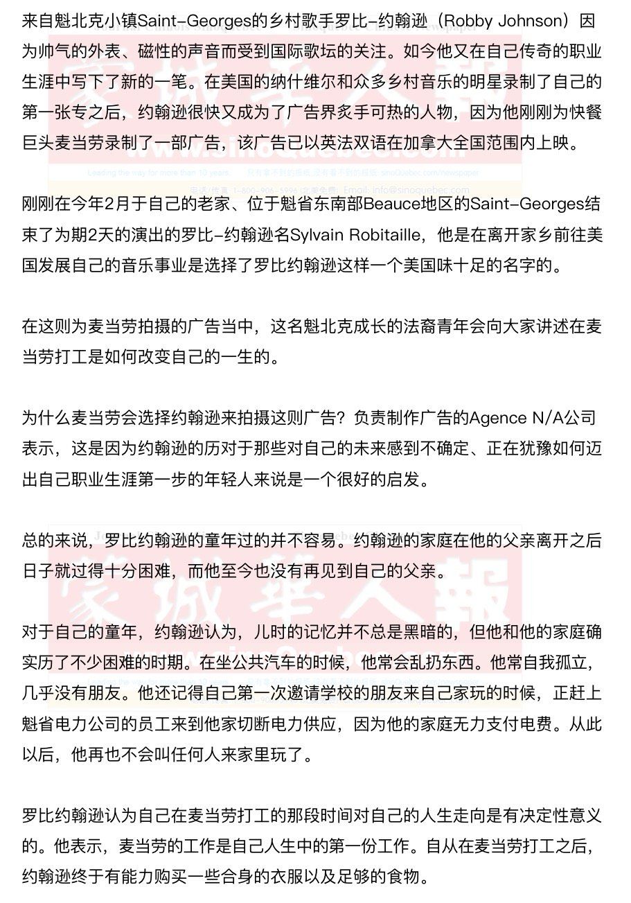 在开始打工之前,他几乎没有任何合身的衣服。他通常会穿一条非常短的牛仔裤,而大家总是会因此取笑他。他当时因为营养不良而又瘦又小,他甚至在童年经历过生长停滞。 为了拍摄需要,广告的摄制组来到了罗比约翰逊曾经学习过的高中校园、位于Lacroix大道上的麦当劳餐厅(他曾经打工的地方)以及他童年曾经居住过的房子进行拍摄。广告过程中还会播放他的一些脍炙人口的歌曲,另外还会播放一些他在去年夏天参加在魁北克城亚伯拉罕平原的夏季音乐节时的片段。 有幸在现场观看广告拍摄的人无不认为罗比约翰逊是一名热爱乡村生活的人。他身上无处不体现着魁北克人热情和质朴等特点。 在摄像机面前,我们可以看到当前来麦当劳就餐的客人们发现是约翰逊时,全都自发的发出赞叹,他们的惊喜之情溢于言表。为了捕捉人们最自然的反应,广告的导演David Hicks事先没有进行任何排练,所有客人们的反应都是最为自然的。 David Hicks表示,他希望约翰逊做最为真实的自己,也就是一名普通的不能再普通的大男孩。他认为,瞬间成名并没有让他发生任何本质上的变化,他仍然像小时候那样谦逊。 ![]() 罗比约翰逊的妻子Pier-Anne Lachance认为,初步涉足广告圈并且为自己的第一任雇主麦当劳拍摄了一则如此感人的广告,对于罗比约翰逊的职业生涯来说好处多多。她认为,这将为约翰逊树立他的信誉,并帮助人们了解约翰逊不为人所知的另一面、让他的形象更加丰满。 |