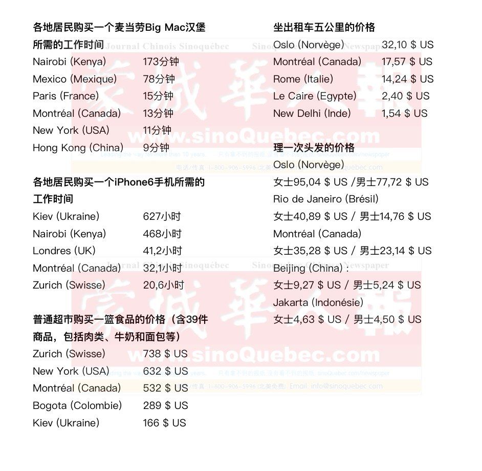 HEC的市场营销学教授Jacques Nantel认为,虽然物价相当高,但是和那些美国以及北欧的大城市相比,蒙特利尔的物价还是很有竞争力的,本地的物价仍然处在可接受范围内,但是税率太高。Jacques Nantel表示,他曾经见过不少国外来的教授在看到自己的第一张工资单上后想马上卷包袱走人。 瑞士UBS银行发布的全球七十多座城市商品与服务价格中的有趣数据 |