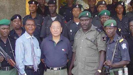 图为胡介国和尼总统总统奥巴桑乔(右)一起 。 上世纪70年代末,在上海南海中学当英语老师的胡介国,来到尼日利亚,投奔在当地打拼多年已成侨领的父亲。 ![]() 图为胡介国和他的部落人。 胡介国拒绝父亲让他继承纺织业的要求,前往加拿大学习饭店管理专业,学成后回尼日利亚,在拉各斯香格里拉饭店给洋老板打工。 ![]() 图为金门大酒楼。 他凭借勤奋和智慧,很快脱颖而出,成为香格里拉饭店总经理,赚得闯荡非洲的“第一桶金”。然后,兴建了金门大酒楼,为尼国标志性建筑和餐饮中心。 目前他旗下的尼日利亚金门集团有11家子公司,主营旅游、餐饮等业务,3万多员工。 ![]() 图为尼日利亚总统向胡介国颁发国家荣誉奖章。 胡介国帮助尼日利亚建起了4所学校。 ![]() 由于胡介国在尼日利亚声望很高,2001年被拉格斯“大都市土皇帝”封为酋长。这是尼日利亚最有声望的“土皇帝”第一次封中国血统的人为他们的酋长。 ![]() 图为胡介国和他的贴身保镖。 胡介国拥有由他全权指挥的近百人的武装警卫队。这些人员由胡介国亲自挑选,但工资由当地政府负担。 ![]() 2001年11月,三名中国驻尼外交官被匪徒劫持,胡介国率5名卫队出动,警察不肯追,他掏美元给他们,掏一把美元警察前进一次,接近边境时,土匪丢下人质越境逃走了。 ![]() 胡介国已成为世界华商领袖之一。如今他担任中国国际贸易对外促进委员会副理事长之一;担任尼中友好协会第一副会长;中国尼日利亚工商联合会名誉主席;尼日利亚中国和平统一促进会秘书长;尼日利亚最高经济参议集团议员和总统的特别顾问。 ![]() 由于尼日利亚实行酋长终身制,胡介国也是终身酋长。以酋长的身份和政府谈判。他的部落还是一夫多妻制,他却没有“选妃”。他和妻子谢美仪的爱情故事,在当地华人社区传为美谈.