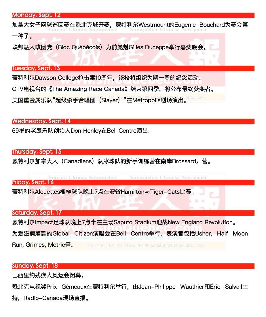 蒙特利尔9月12日至12月18日重要活动,蒙特利尔Dawson College枪击案10周年,该校将组织为期一周的纪念活动。 美国重金属乐队“超级杀手合唱团(Slayer)”、69岁的老鹰乐队创始人Don Henley等在蒙特利尔演出,为爱滋病筹款的Global Citizen演唱会在Bell Centre举行。巴西里约残疾人奥运会闭幕。魁北克电视奖Prix Gémeaux在蒙特利尔举行。 |