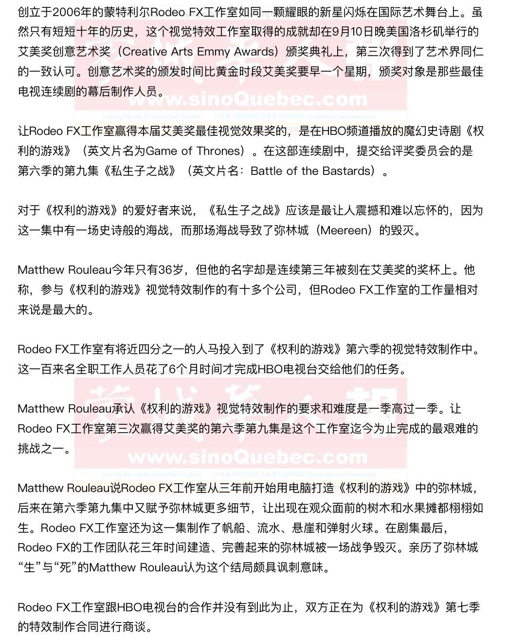 Rodeo FX工作室的视觉特效总监Matthew Rouleau介绍说,HBO电视台通常是根据剧集的播放效果来决定提交哪一集给评奖委员会,但他们这些特效制作人在尚未正式开工的时候就知道这个殊荣会落到第六季第九集的头上,所以从一开始便感觉到些许压力。Matthew Rouleau和他的工作团队巧妙地化压力为动力,再一次夺得艾美奖这个电视工业最享有盛名的奖项。 Rodeo FX工作室在《权力的游戏》第六季中的突出成就 Rodeo FX工作室为《权力的游戏》第六季的前八集制作了152个特效镜头,其中包括发生在弥林城门前关键一战的战争场面。为配合季播电视剧紧凑的制作日程,Rodeo FX工作室通过一百来名全职员工六个月的高效工作,为这部热播剧打造出电影级特效,给世界各地的电视观众带来震撼性的视觉体验。《权力的游戏》第四季和第五季的特效制作已经为Rodeo FX工作室赢得了两次艾美奖,后面的第六季第九集又让这个工作室再次捧起艾美奖奖杯。 Rodeo FX工作室的视觉特效总监Matthew Rouleau说这是他们第三次参加《权力的游戏》的特效制作。与前面的第四季和第五季相比,第六季剧情的规模和场景更加宏大,Rodeo FX工作室面临的挑战也就更艰巨、更刺激。 |