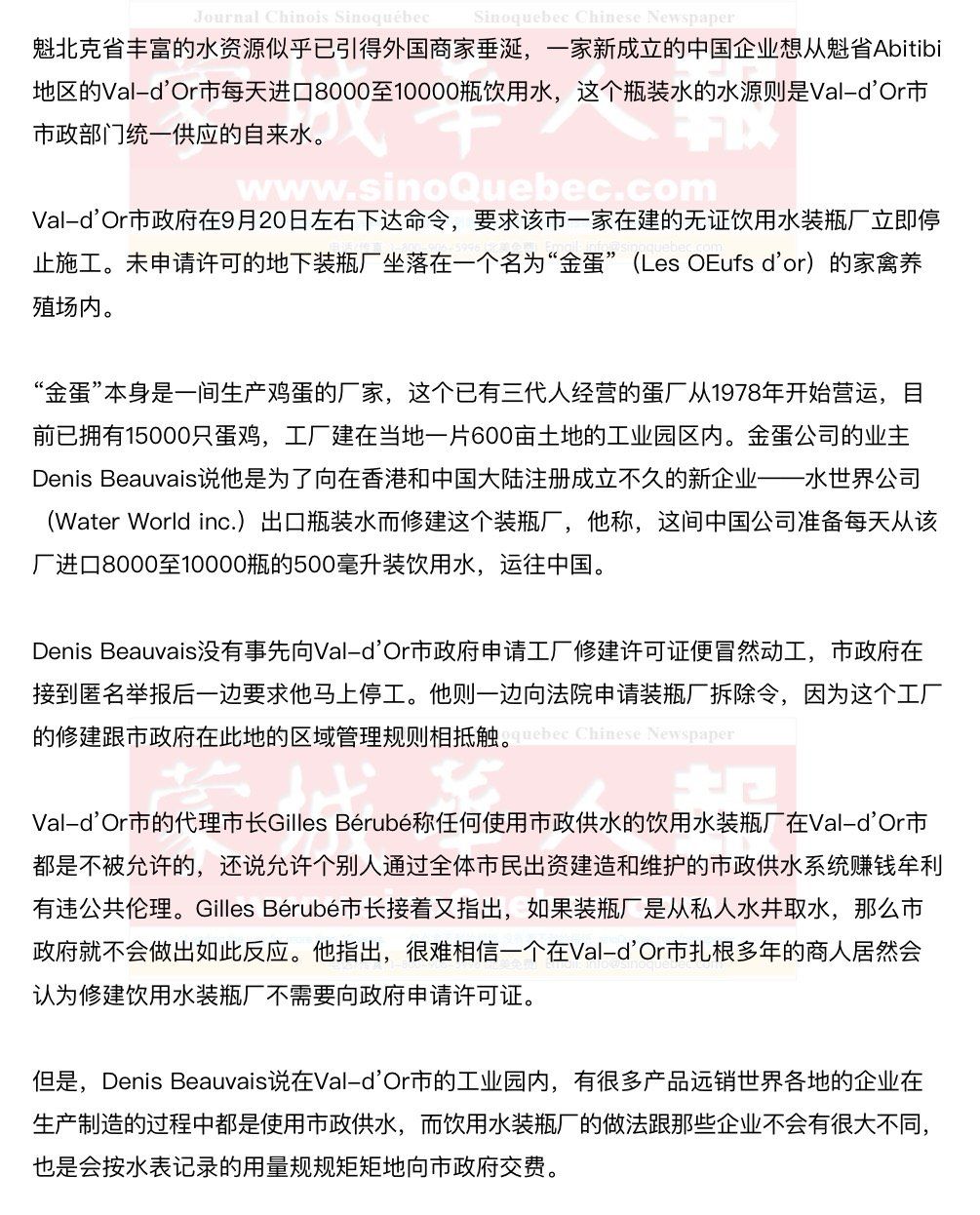 然而,Val-d’Or市政府不愿该市的市政供水出口到中国,称Denis Beauvais的装瓶厂将使得Val-d’Or市的自来水需求量上升1%左右,这不仅会增加该市市政供水系统的运营成本和费用,同时还会对供水系统造成其他一些重大影响。 Denis Beauvais则说允许建造瓶装水生产线的管理规定可以追溯到25年前,政府在那些文件中并没有规定不能用市政供水装瓶。 在Denis Beauvais看来,市政供水的用途对于各企业来说都不尽相同,他应该有权将市政供水用于出口。Denis Beauvais还说Justin Trudeau总理刚刚为推动加拿大产品出口而访问了中国,而他要做的正是对中国出口。 Denis Beauvais抱怨魁北克省有太多损害企业利益的条条框框,隔壁的安大略省就不是这样。 |